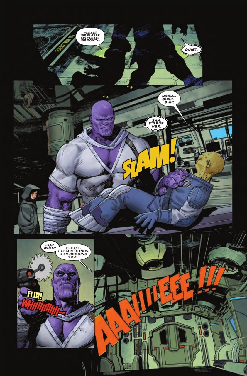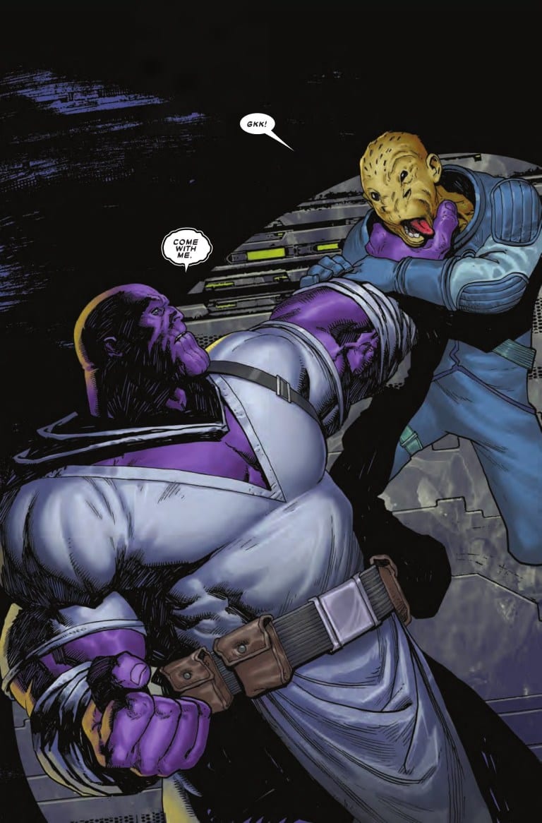 Visually, Ariel Olivetti’s dynamic style works hand-in-glove with Howard’s story. He perfectly captures the darker tone of the narrative here, often in subtle, detailed renderings of the characters and a deep understanding of anatomy and facial expressions. Olivetti’s page composition and inventive use of panels keeps pace with Howard’s lively narrative. There are several splash pages that are just gorgeous examples of how these visually powerful pages should be used to punch up the pace. Olivetti is at his eye-popping best when rendering these intense story moments, for example there is a page depicting Thanos choking the life out of a much smaller opponent that is worthy of being a poster. Antonio Fabela’s unique palate choices are intense without being garish, adding an electricity particularly to the space sequences. The entire book looks amazing from the opening panels set against a field of stars to the very last page, we are left wanting more.