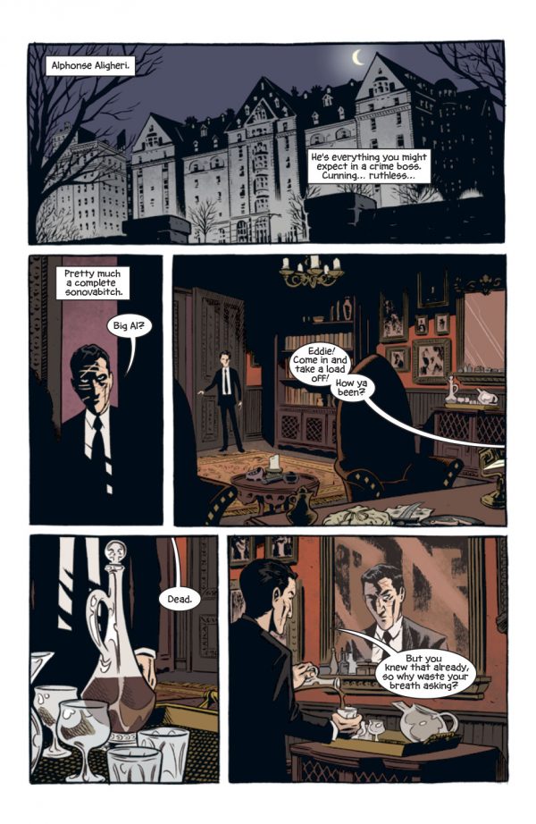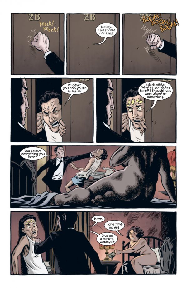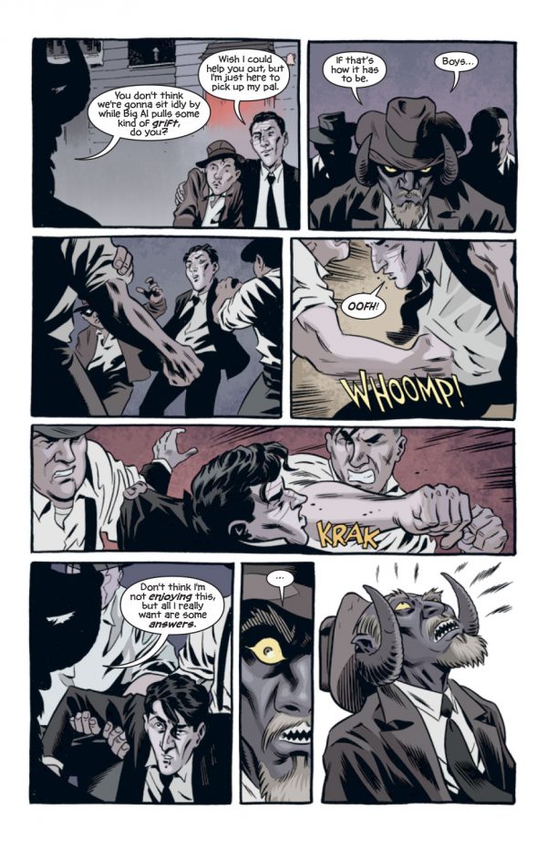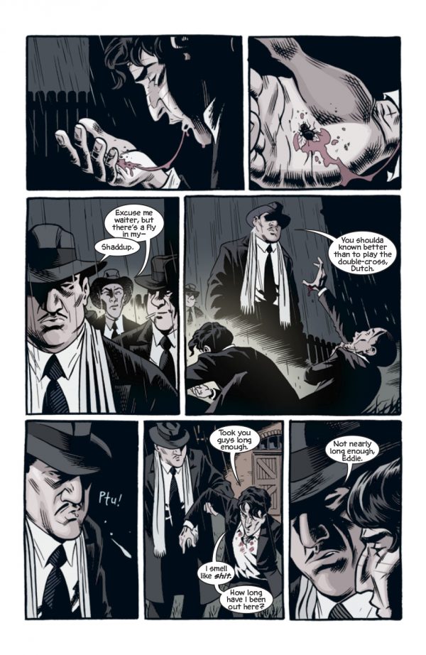 Cullen Bunn is no stranger to prohibition times, gangsters, crime bosses and their molls from his work on The Shadow, of which I quite enjoyed.  Here it’s as if Bunn has looked at his own work, thrown in a little Hellboy, maybe a little Constantine and sprinkle with a little 20’s art deco for a tale that is as convoluted as it is crowded.  Eddie’s life seems to be one of constant threats, which with his powers of recuperations shouldn’t really  pose him any real problems.  Still, he manages to annoy those who seem important to him as equally as those who despise him.  Bunn writes in an effective manner, his characters falling into cliché which potentially could spoil this book for some, although sometimes you don’t have to break the mould to tell a good story.  Sometimes a cigar is just a cigar.  Either way, the writing has a 20’s gangster feel to it, which gives the book a real sense of the vibe that Bunn appears to have been aiming for.