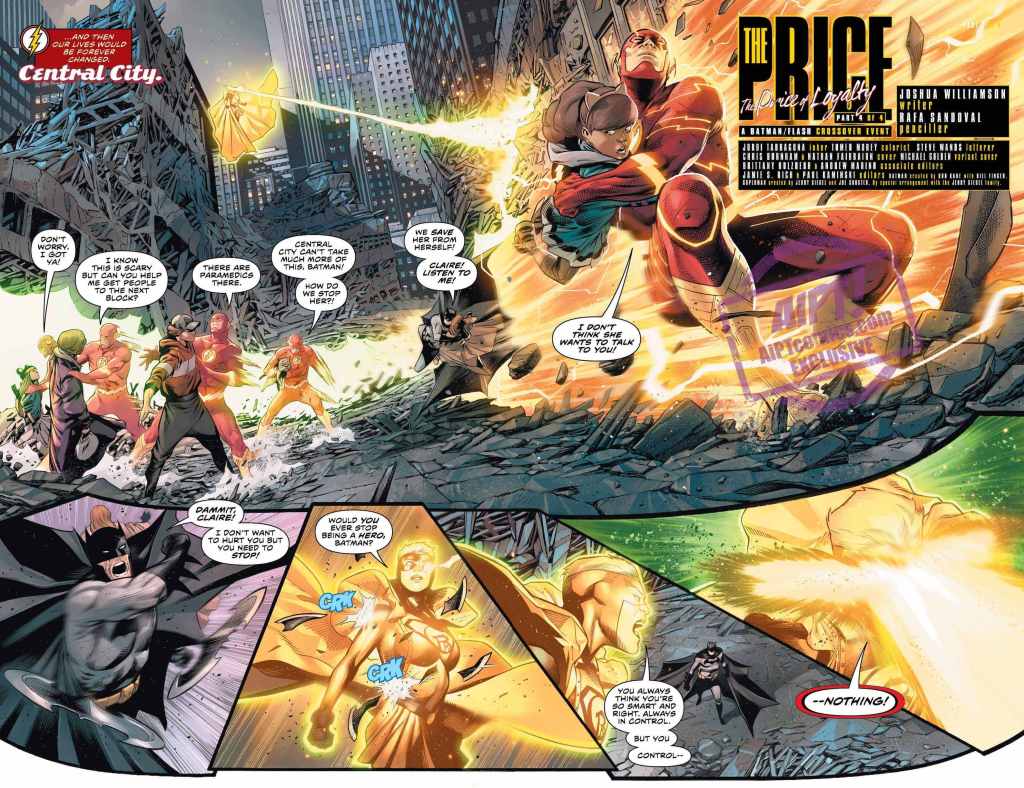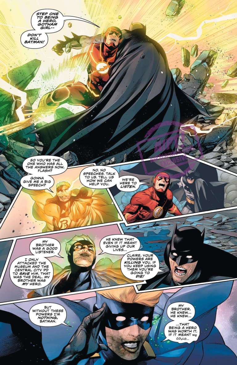 The final chapter of the mystery, aptly titled, The Price of Loyalty certainly pertains to Batman and the Flash’s strained partnership, however as the narrative unfolds we see that it could just as aptly apply to Barry and Iris West’s equally strained relationship. Joshua Williamson’s stint as interim writer on Batman has been a welcome infusion of verve on that title. Williamson flawlessly weaves the Dark Knight into his Flash run, expertly hitting story beats that lend themselves to a deeper development of both iconic characters, particularly their shared expertise in the deductive arts and sciences. The tone of this arc has been decidedly darker than Williamson’s run on the Flash, however it works perfectly with the subject matter. In this crossover Williamson has valiantly taken on the task of clearing up the waters muddied by the events of Heroes in Crisis. The Price does that by revisiting the hanging plot thread of Gotham Girl and her brother Gotham, in that sense Williamson’s narrative is firmly founded on Tom King’s early Batman run which speaks volumes to placing King’s problematic HiC narrative in continuity. I make this point because so many DC fans are wondering if the story is in fact canonical or an elaborate Elseworlds-like event that will have limited effects on the DCU proper. Williamson does a really solid job of bringing all of these moving pieces into reasonable positions to move them all forward.
