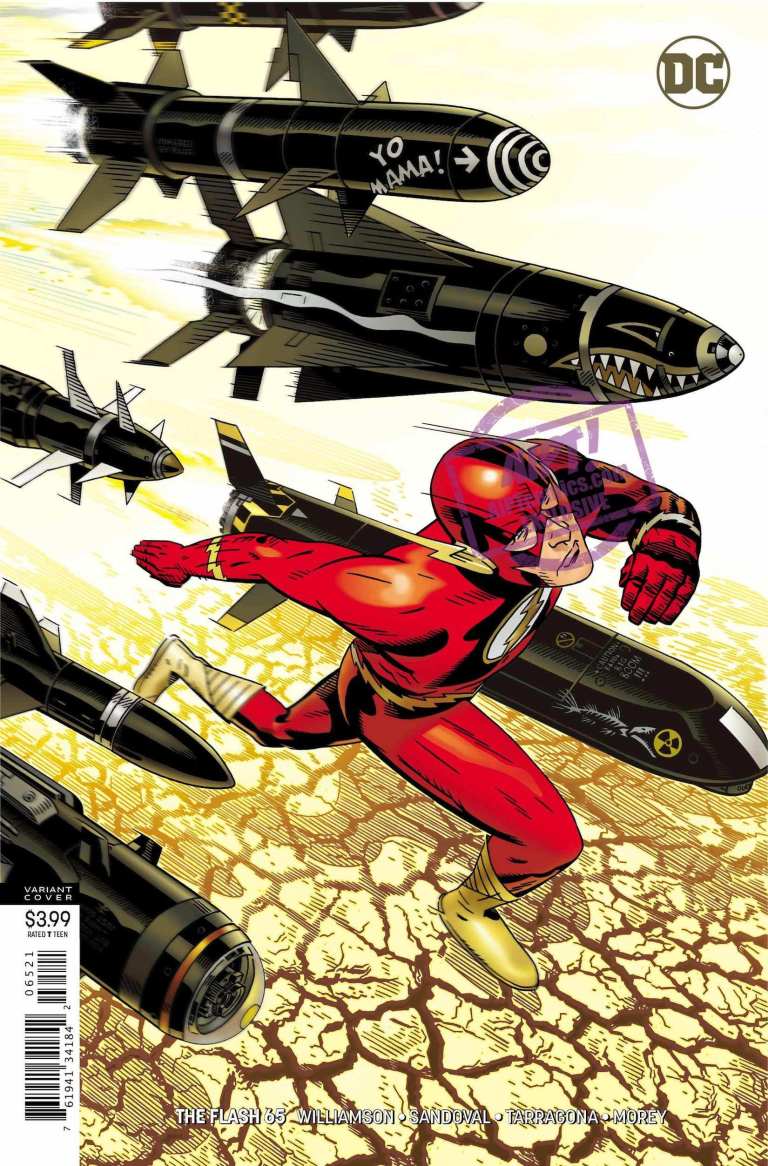 Rafa Sandoval is at the peak of his artistic prowess here. His inventive use of irregularly shaped panels adds so much energy to his page designs adding a visual urgency to the issue that matches Williamson’s narrative. The entire composition of the issue is extremely dynamic, Sandoval makes optimum use of splash pages, using them as a sort of visual exclamation point. The images move through the issue under their own momentum, the Flash crackles with Speed Force lightning from beginning to end. Jordi Tarragona’s inks are the perfect compliment to Sandoval’s kinetic pencils. Tarragona’s precise line work and use of solid blacks work extremely well with Tomeu Morey’s electric colors. Morey’s vibrant pallet amps up the energy even further bringing every page fully to life with bristling,vivacious color.