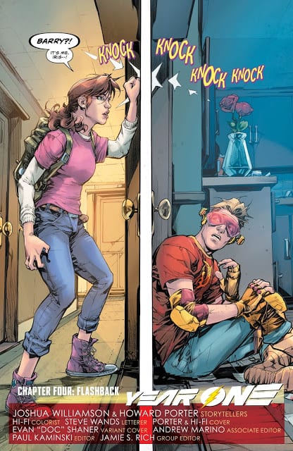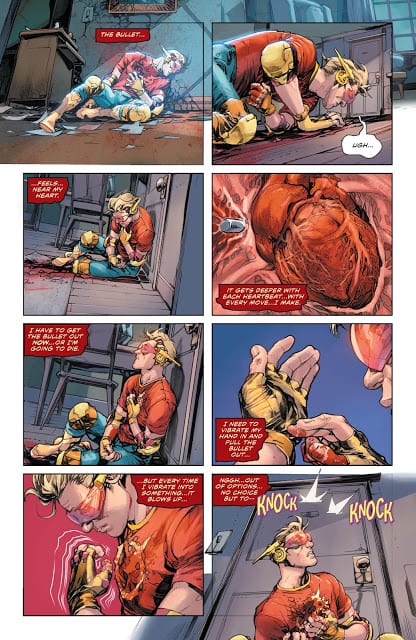 “Year One” has become something of a brand in the DC Universe; beginning with Frank Miller and David Mazzucchelli’s now legendary 1987 arc it has gone on to serve as the title of choice for re-telling the origins of many of DC’s most iconic heroes. Joshua Williamson and Howard Porter’s “Year One” arc continues to recount Barry Allen’s earliest days as The Flash in dramatic fashion. Of course there are super-heroics, intense action and absolutely mind-blowing visuals, but the most impressive elements of this narrative are the human elements, the small moments of introspection between the confrontations with the sinister Turtle, the villain from the Flash’s future now plaguing his present. Williamson focuses on a Flash who has yet to master the Speed Force, in fact much of this arc has been a journey of self-discovery as Barry learns of new and wonderful abilities on the fly, literally on-the-job training for Speedsters. One of Barry’s now frequently used abilities is his phasing ability, which as of this issue he is far from mastering. This is an element of his newly acquired Speed Force powers that could save his life, this issue begins with Barry suffering from a gunshot wound, the bullet still in his body. Time for more of that on-the-job training. In one of the most dramatic and tense scenes of the arc Barry must decide to phase his hand into his body and remove the bullet, as if the tension need to be amped up, Iris is pounding on his door shouting to him while he is attempting to save his own life by employing this delicate and very precise procedure.