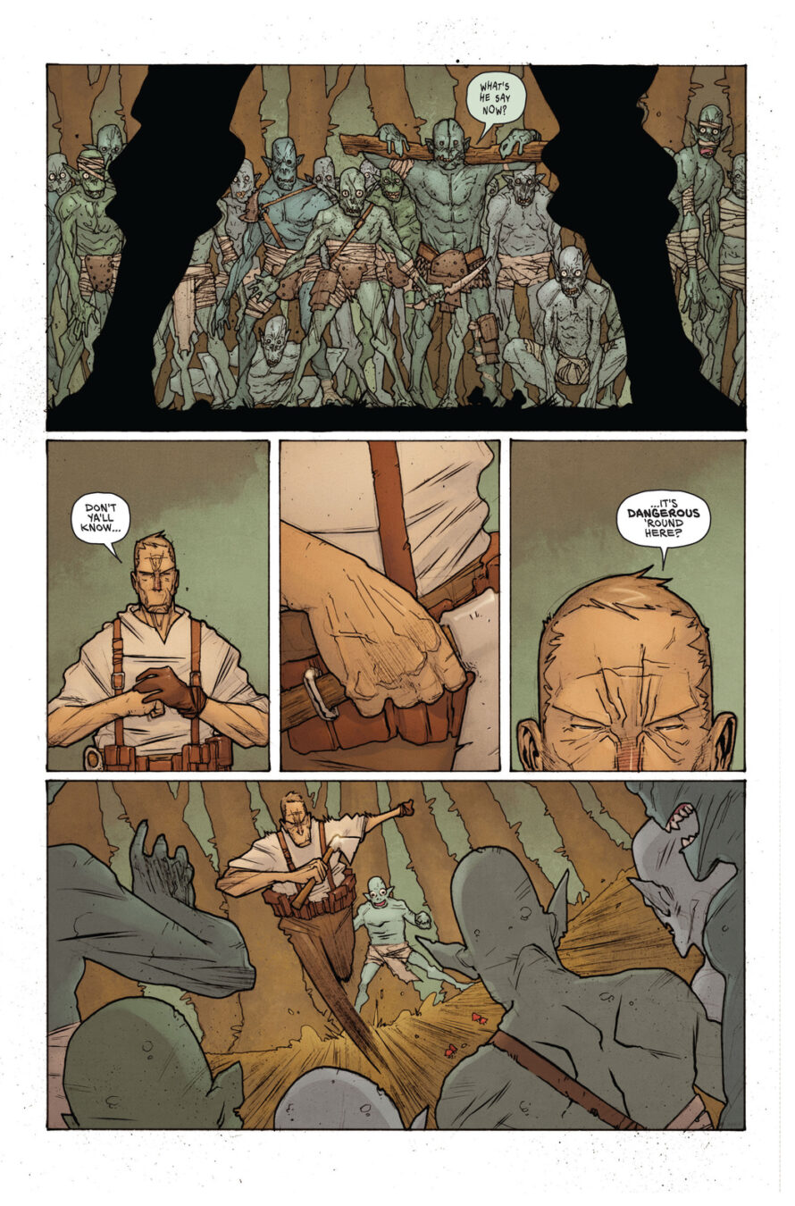 Kevin Castaniero added, “Grit is one of those books that, for me, was this perfect storm of violence and humour. Getting to draw Barrow hacking away at goblins in one instance, and then Barrow getting down on the ground to investigate something… less heroic, was a blast. I hope you all have as much fun reading this book as I did drawing it.”