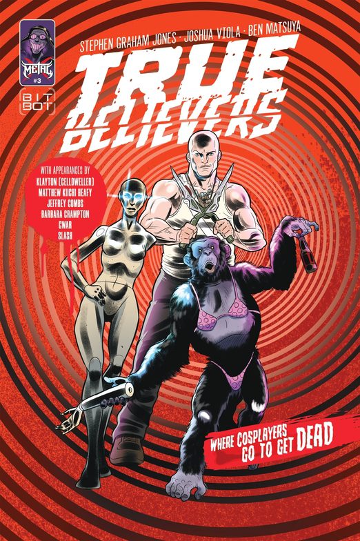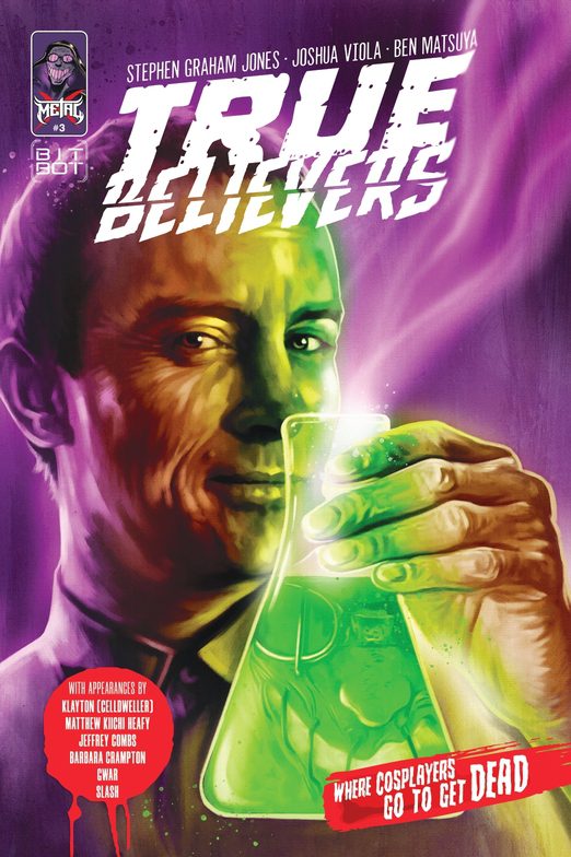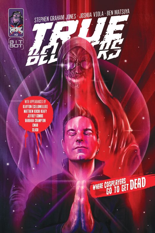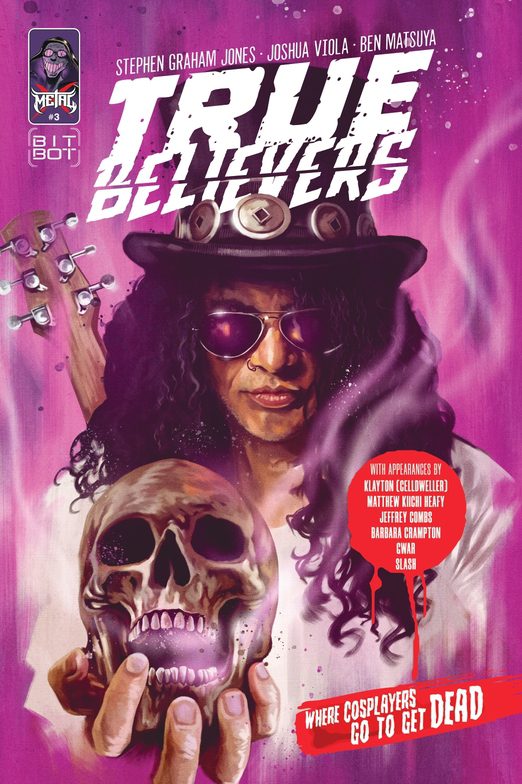 Stephen Graham Jones, whose latest novel, The Buffalo Hunter Hunter, was featured on President Barack Obama’s 2025 Summer Reading List, and Denver Post bestselling writer Joshua Viola are returning to the deadly world of their comic book series TRUE BELIEVERS for a frightening grand finale. The star-studded, blood-soaked, final issue features appearances by Guns N’ Roses guitarist Slash, Re-Animator and From Beyond stars Barbara Crampton and Jeffrey Combs, and fan-favorite musician and Bit Bot Media co-founder Klayton of Celldweller. Previous issues of TRUE BELIEVERS featured some of the biggest names in horror — iconic actress Jamie Lee Curtis, the band GWAR, bestselling novelist R.L. Stine, screenwriter and film director Jeffrey Reddick (Final Destination), musician Matthew Kiichi Heafy, actor Devon Sawa, and the characters from the cult horror film Deathgasm. TRUE BELIEVERS: ISSUE #3 – SLASHFEST will be available from Bit Bot Media on October 13, featuring art by Ben Matsuya, letters by Jeremiah Lambert, four variant covers from acclaimed horror artist Matthew Therrien and a main cover by Lambert and Matsuya.