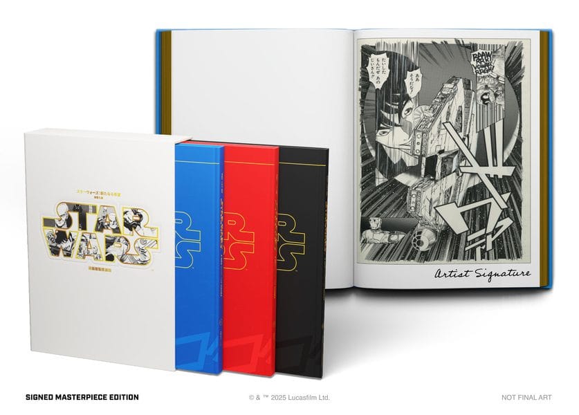 As part of the campaign, fans can also purchase the Tamaki Art Print Set, a curated set of six prints featuring standout pages from Hisao Tamaki’s Star Wars: A New Hope manga. While the artwork is black and white, each print is reproduced in full color to capture every nuance of the art boards— from fine pencil marks and paste-ups to editorial notes and the natural aging of the paper. Fans can also select the Tamaki Art Triptych Folio, a large-format, three-panel folio designed to match the height of the Masterpiece Edition, containing two complete triptych print sets.