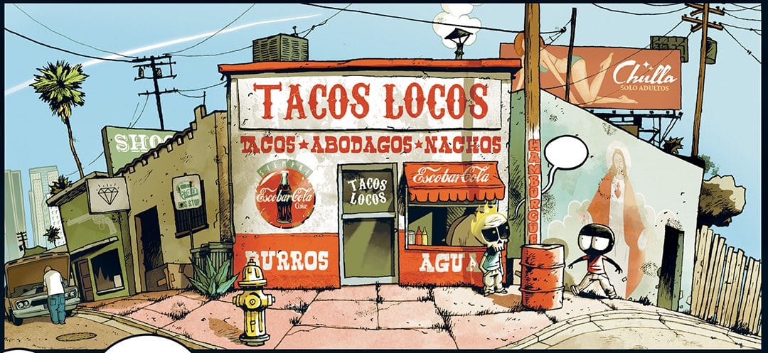 Young Angelino (a kid with a jet black cueball for a head) could be the key to stopping (or starting) the End of the World, and he and his buddy Vinz (a kid with a flaming skull for a head) find themselves pursued by mysterious Men in Black, territorial street gangs, and a team of Mexican wrestlers who’ve been guarding mankind for decades. Together, they unravel a global conspiracy that will blow your mind.