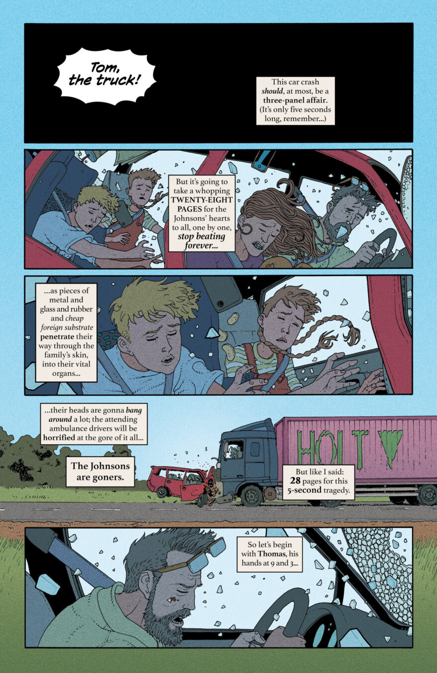 Last year’s Ice Cream Man #39: “Decompression in a Wreck, Part One,” has been nominated for Best Single Issue/One-Shot for the 2025 Eisner Awards. The issue is the first in a two-parter story that shows how time slows down and life flashes by during a deadly heart-and-bone-breaking car accident, resulting in the death of a family. The comic details how decompression works in comics storytelling, and how a mere five seconds of a tragedy can be stretched into a 28-page deep dive. “Each moment sacred, each millisecond housing a loving memory, or a painful reminder, or an enticing glimpse into a future that will never, ever happen…” writes Prince in the comic.