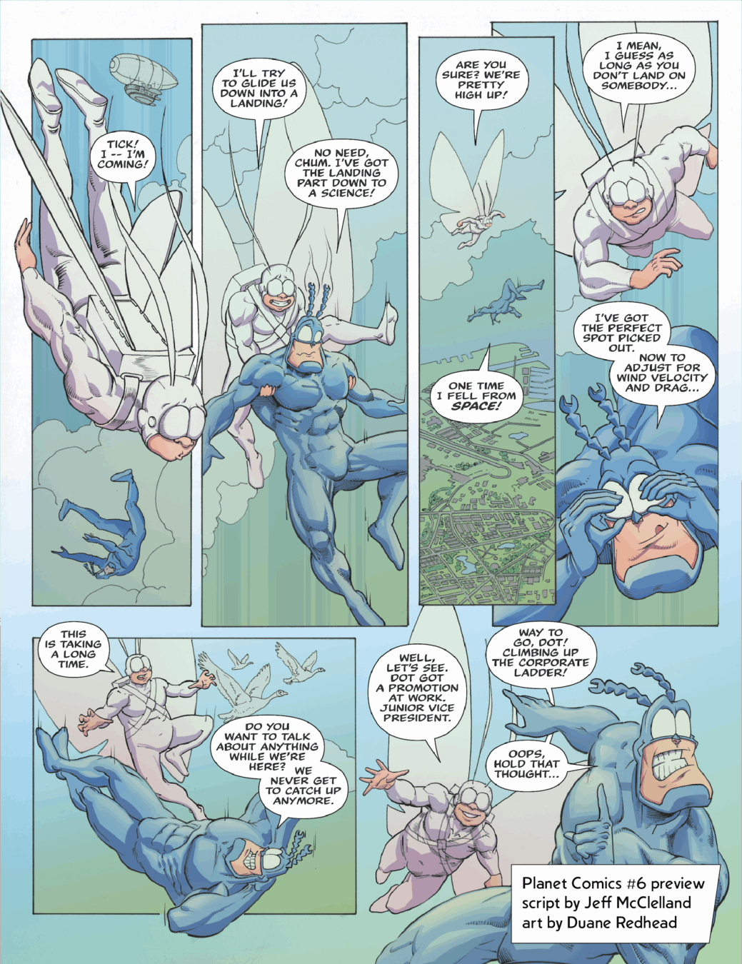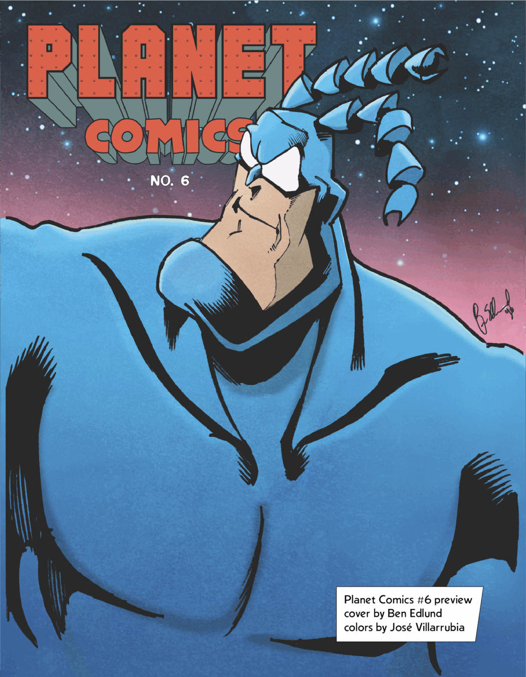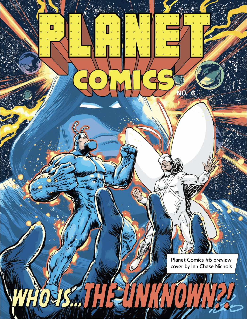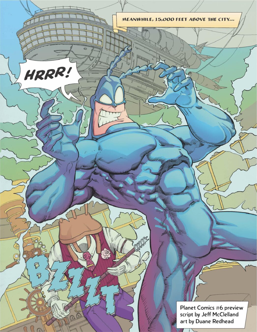 The Tick, Ben Edlund’s big, blue bug of justice, returns to comics in a special, two-part story beginning in Planet Comics #6, now on the crowdfunding site Kickstarter. Through special arrangement with Edlund, The Tick, Arthur, Chairface Chippendale and more appear in an all-new story in the retro sci-fi anthology series.