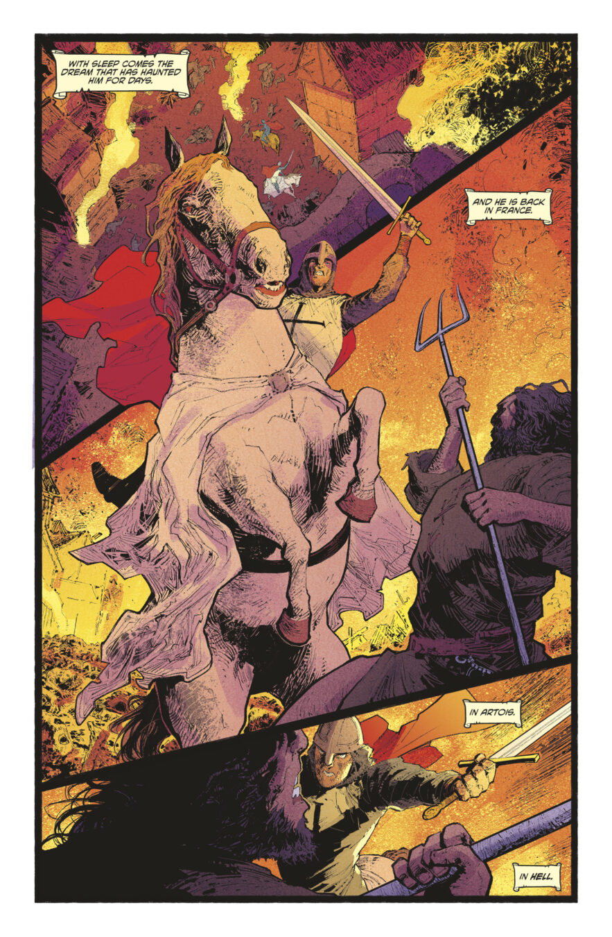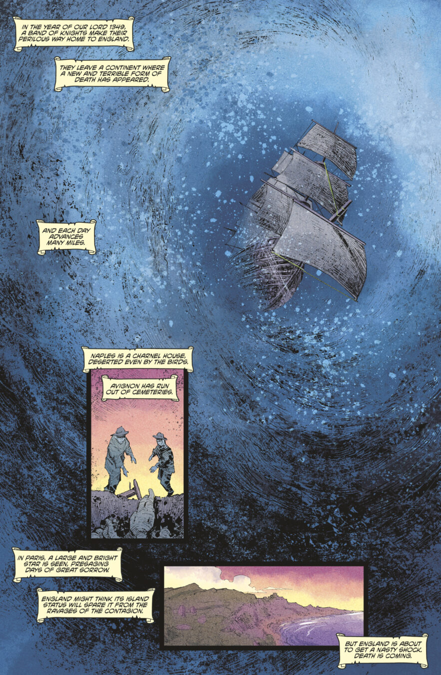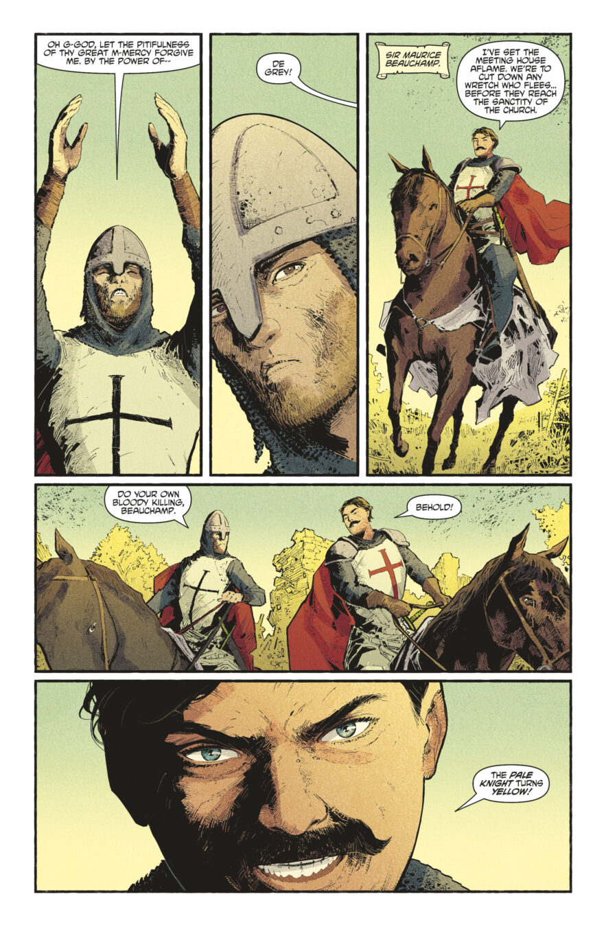 “The Pale Knight has a particular, terrible resonance, set as it is in a world suffering from an even deadlier plague that decimated populations in the 1340s,” said Peter Milligan. “This book blends my love for Bergman’s iconic The Seventh Seal with my fascination for the Black Death to craft a horror story that feels both timeless and disturbingly modern. Val Rodrigues’s stunning art brings this apocalyptic world to life in a way that perfectly captures the moral torment and supernatural horrors of this tale.”