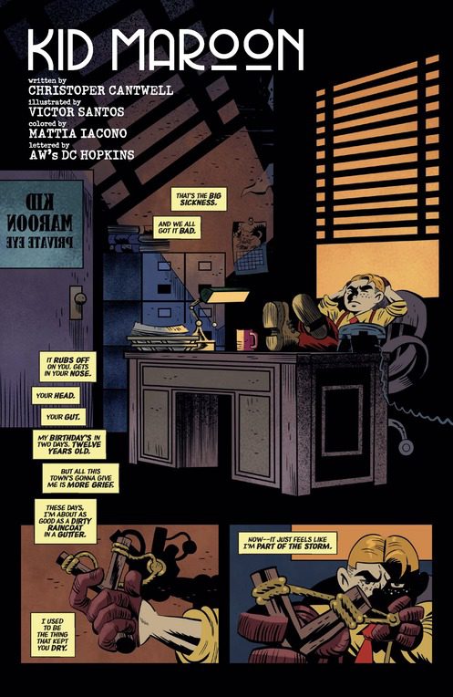 “I’ve been wanting to write a Kid Maroon story for years upon years now,” said Cantwell. “Because Kid Maroon feels like me. It’s funny because I remember being a kid and how I couldn’t wait to grow up. Every day I feel like I grew up too fast. I often wish I could go back. Kid faces that same struggle in our book. Sure, his world is laden with pulp gangsters and killers, but he’s very much a child. This was always the undercurrent of the original Kid Maroon strips that Pep Shepard did. Sure, sometimes Pep occasionally had Kid rail against characters like Captain Pinko and write diatribes against Sales Tax, but at his best, those stories were always about a boy caught between worlds, his innocence always fragile, at risk of being shattered. That is the core of our book through and through.”