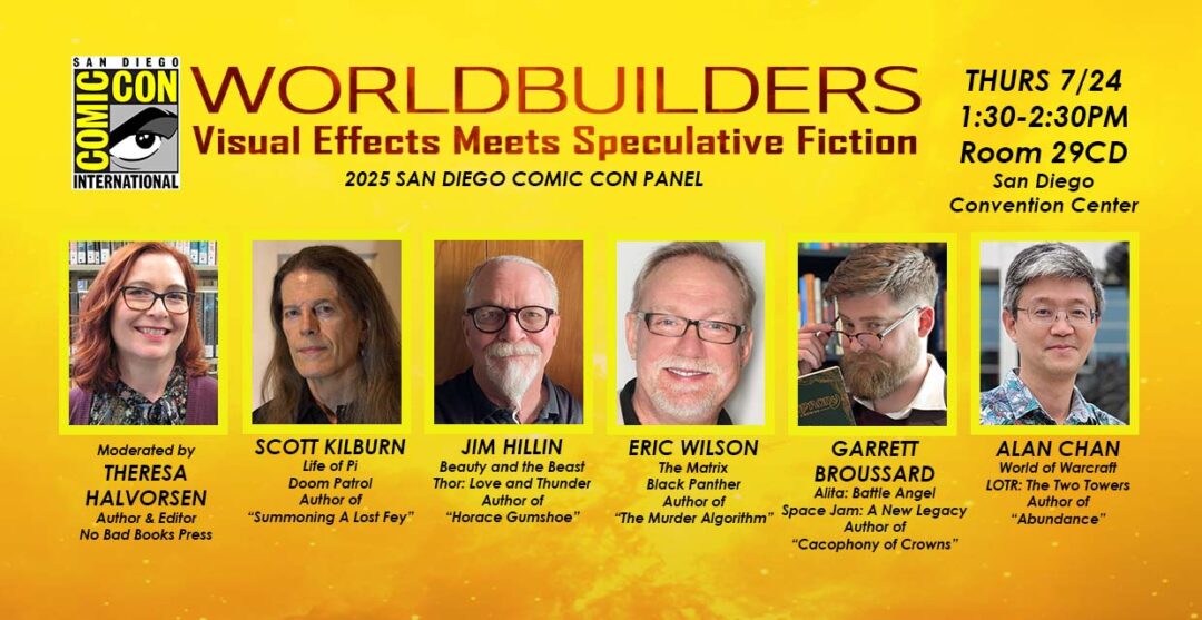 In Worldbuilders: Visual Effects Meets Speculative Fiction, acclaimed VFX artists and supervisors Scott Kilburn (Life of Pi, Doom Patrol), Jim Hillin (Beauty and the Beast, Thor: Love and Thunder), Wilson Kincaid (The Matrix, Star Trek: Discovery), Alan Chan (World of Warcraft: The War Within, LOTR: The Two Towers), and Garrett Broussard (Alita: Battle Angel, Space Jam: A New Legacy) take the stage to explore how their backgrounds in visual storytelling have influenced their science fiction and fantasy writing.