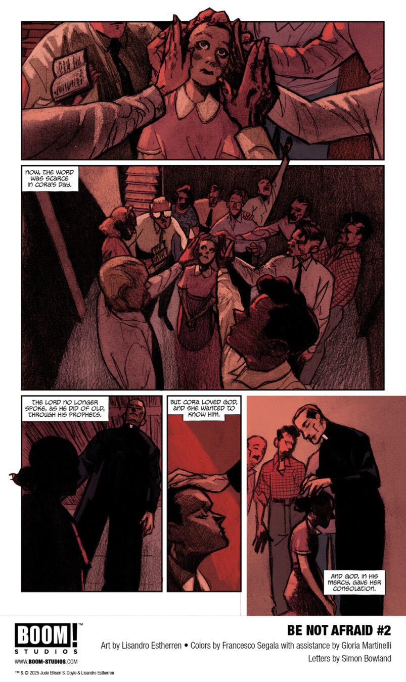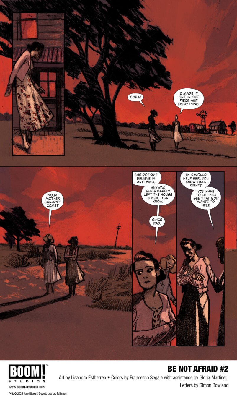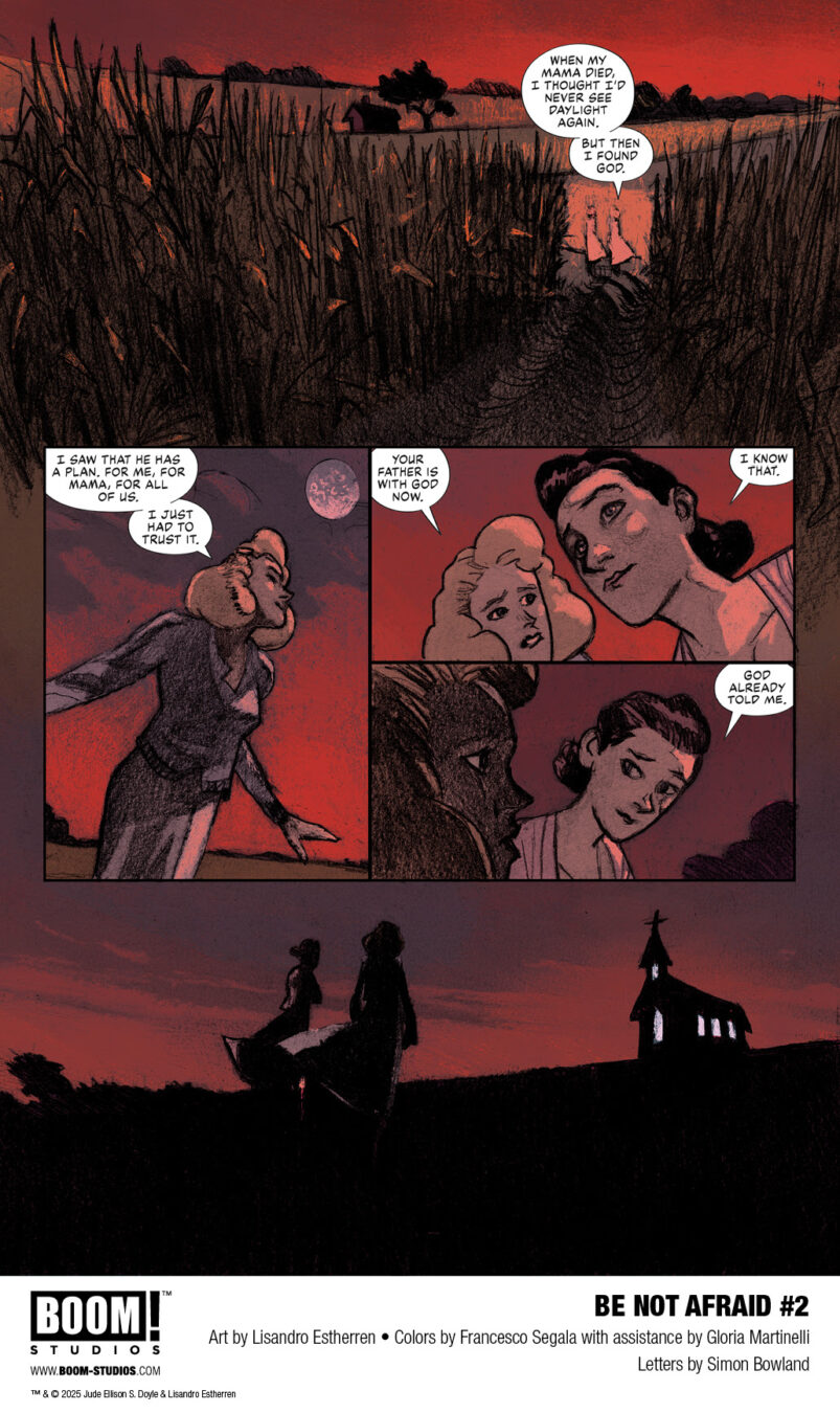 BOOM! Studios today revealed a first look at BE NOT AFRAID #2, the breathtaking continuation of the new original series from Jude Ellison S. Doyle (Hello Darkness, Maw), artist Lisandro Estherren (Redneck), colorist Francesco Segala with assistance by Gloria Martin, and letterer Simon Bowland. Equal parts feminist rage and rural folk horror, this descent into Hell itself is a nightmare ride fueled by the underpinnings of American Evangelical tradition and brutal cosmic horror! Available in comic shops everywhere July 2025.