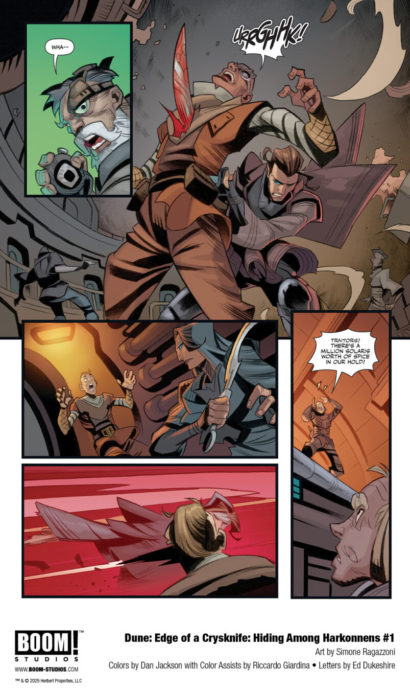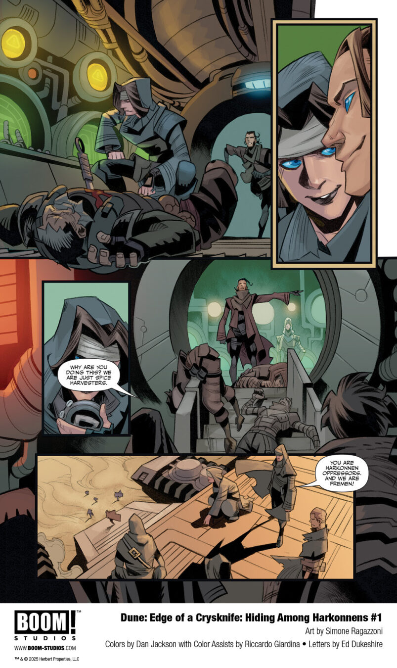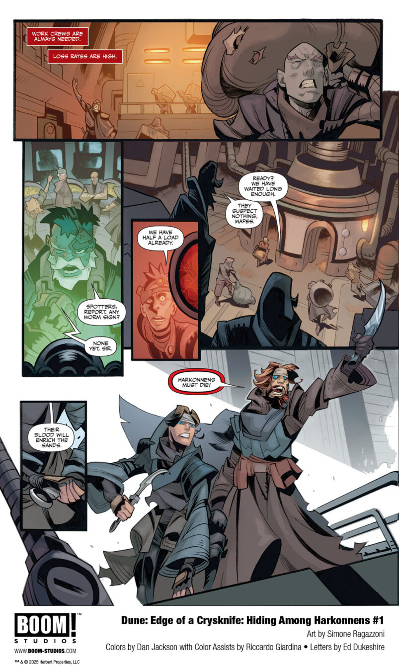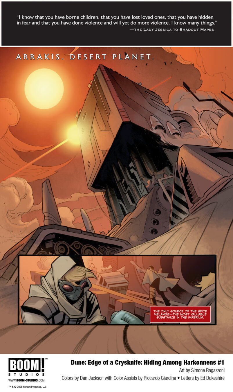 BOOM! Studios today revealed a first look at DUNE: EDGE OF A CRYSKNIFE: HIDING AMONG HARKONNENS #1, a brand-new one-shot further expanding the vast and rich universe of Frank Herbert’s seminal sci-fi novel Dune. The exploration into unexplored regions of the Dune mythos is penned by award-winning novelists Brian Herbert and Kevin J. Anderson, with acclaimed Dune artist Simone Ragazzoni returning to illustrate, colorist Dan Jackson with color assists by Riccardo Giardina, and letterer Ed Dukeshire.