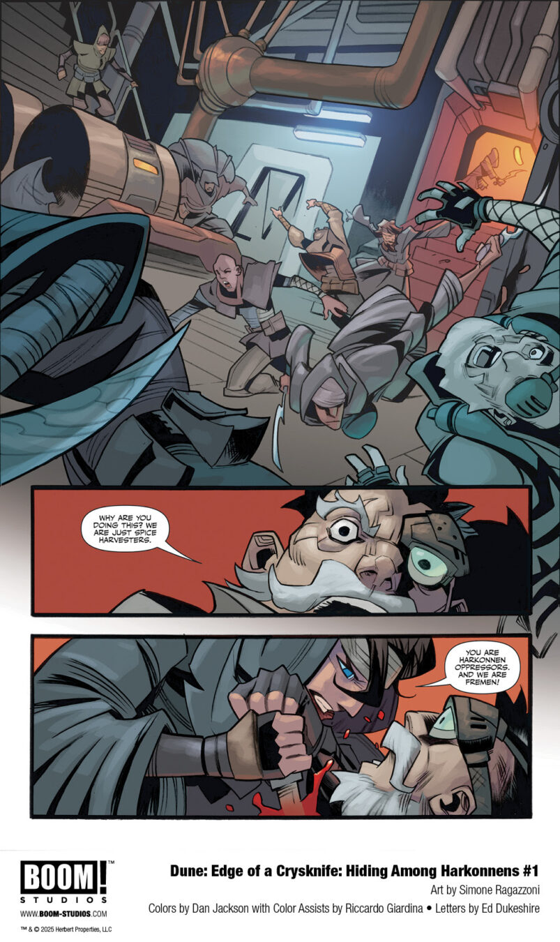 BOOM! Studios today revealed a first look at DUNE: EDGE OF A CRYSKNIFE: HIDING AMONG HARKONNENS #1, a brand-new one-shot further expanding the vast and rich universe of Frank Herbert’s seminal sci-fi novel Dune. The exploration into unexplored regions of the Dune mythos is penned by award-winning novelists Brian Herbert and Kevin J. Anderson, with acclaimed Dune artist Simone Ragazzoni returning to illustrate, colorist Dan Jackson with color assists by Riccardo Giardina, and letterer Ed Dukeshire.