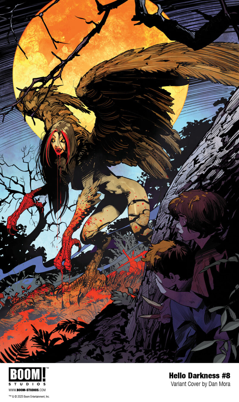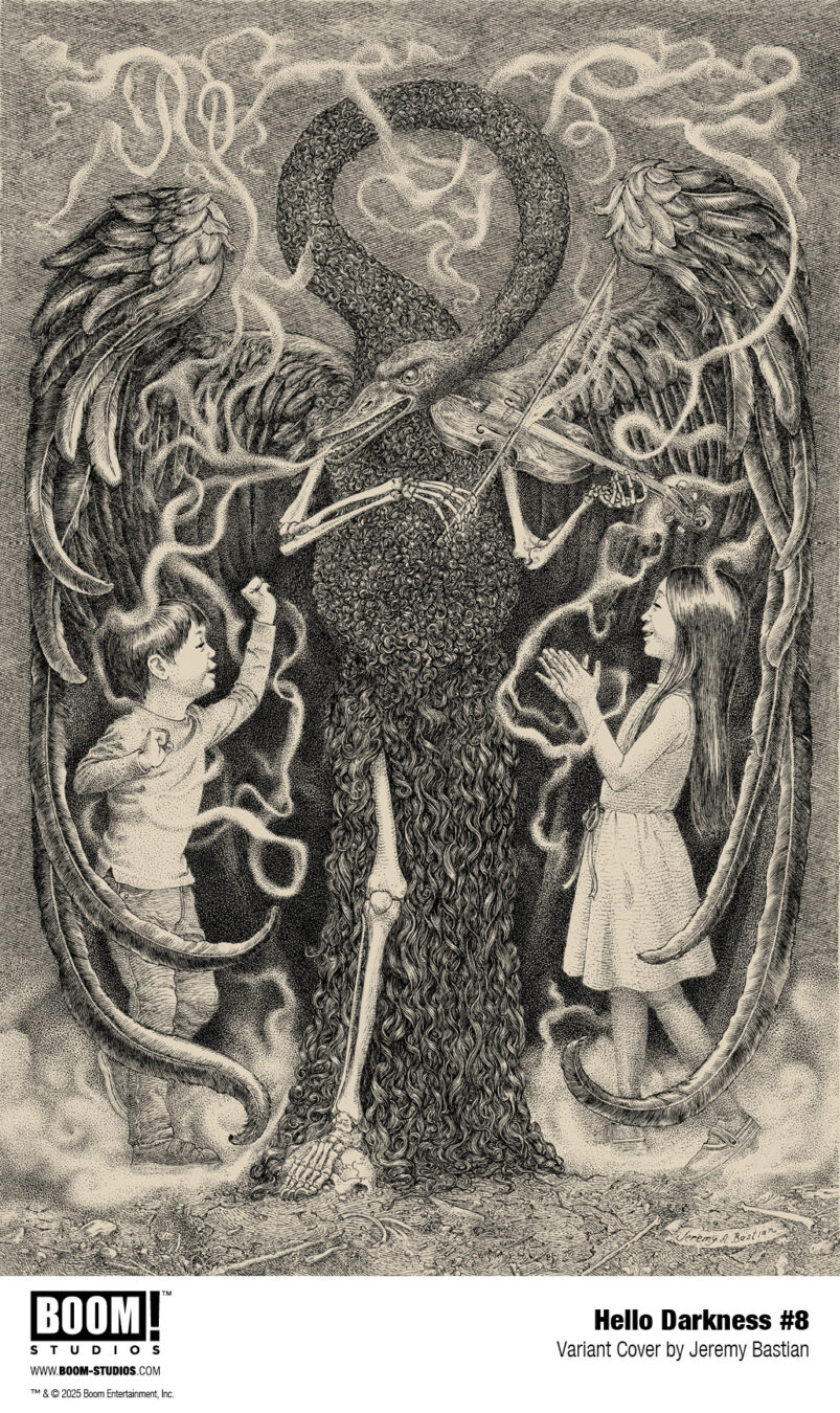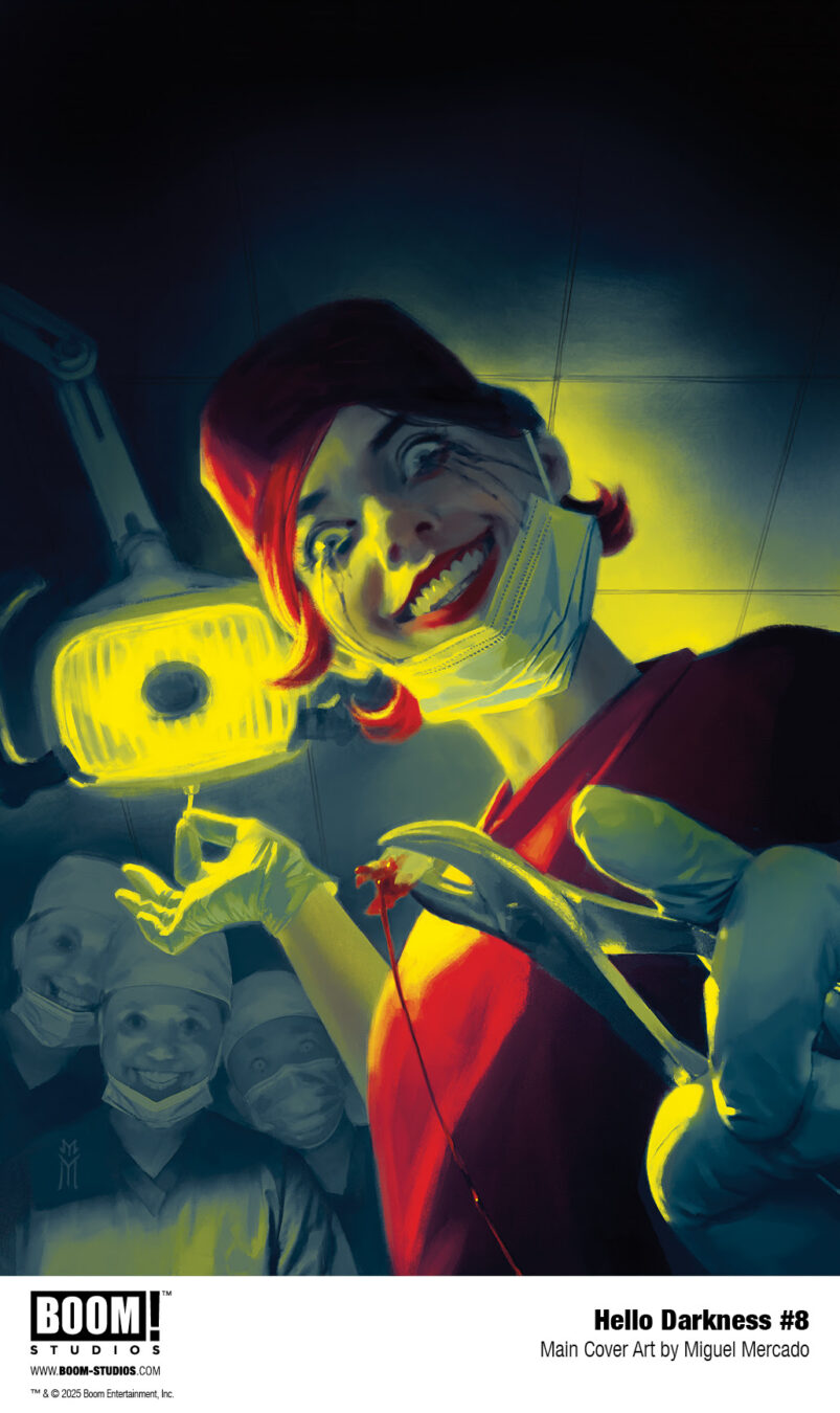 HELLO DARKNESS #8 features a main cover by Miguel Mercado (The Amazing Spider-Man), and variant covers by Jenny Frison (Something is Killing the Children) and Jeremy Bastian (Cursed Pirate Girl), and a special BOOM! Studios 20th Anniversary variant by Dan Mora (Once & Future).