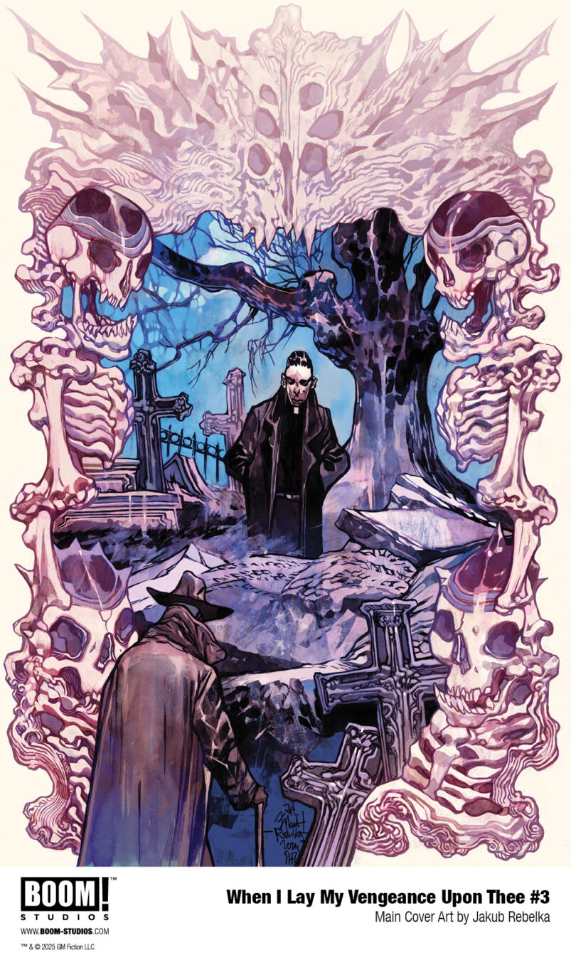 WHEN I LAY MY VENGEANCE UPON THEE #3 features main cover art by series artist Jakub Rebelka, and variant covers by acclaimed illustrators Jacob Phillips (That Texas Blood) and Martín Morazzo (Ice Cream Man) with Chris O’Halloran.