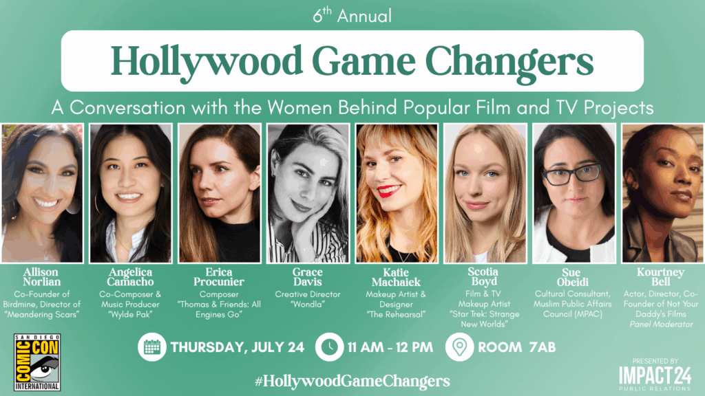 With co-founder of BirdMine Allison Norlian (Director of Meandering Scars), co-composer & music producer Angelica Camacho (Wylde Pak), Composer Erica Procunier (Thomas & Friends: All Engines Go), creative director Grace Davis (Wondla), makeup artist & designer Katie Machaiek (The Rehearsal), film and TV makeup artist Scotia Boyd (Star Trek: Strange New Worlds), and cultural consultant Sue Obeidi (Muslim Public Affairs Council (MPAC)). Moderated by actor, director, and co-founder of Not Your Daddy’s Films, Kourtney Bell. Part 1 of Impact24 PR’s Panel Superblock Series.