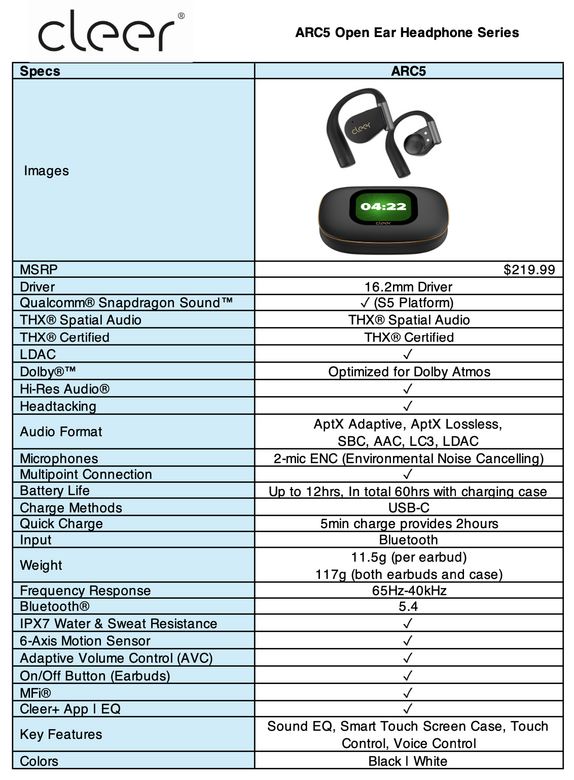 Available now in Black and White for $219.99, the Cleer ARC 5 Open-Ear Earbuds are currently available at CleerAudio.com and authorized U.S. dealers.