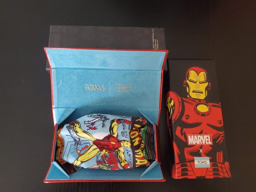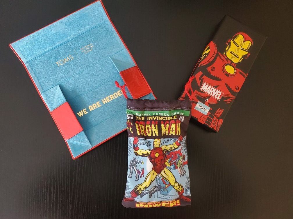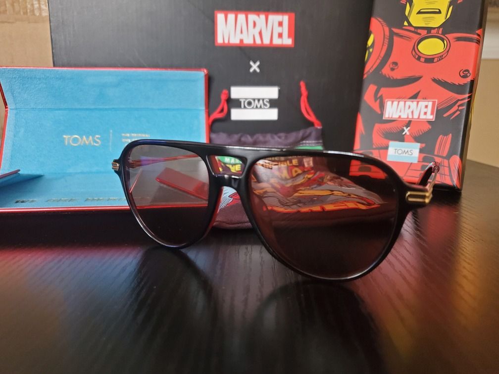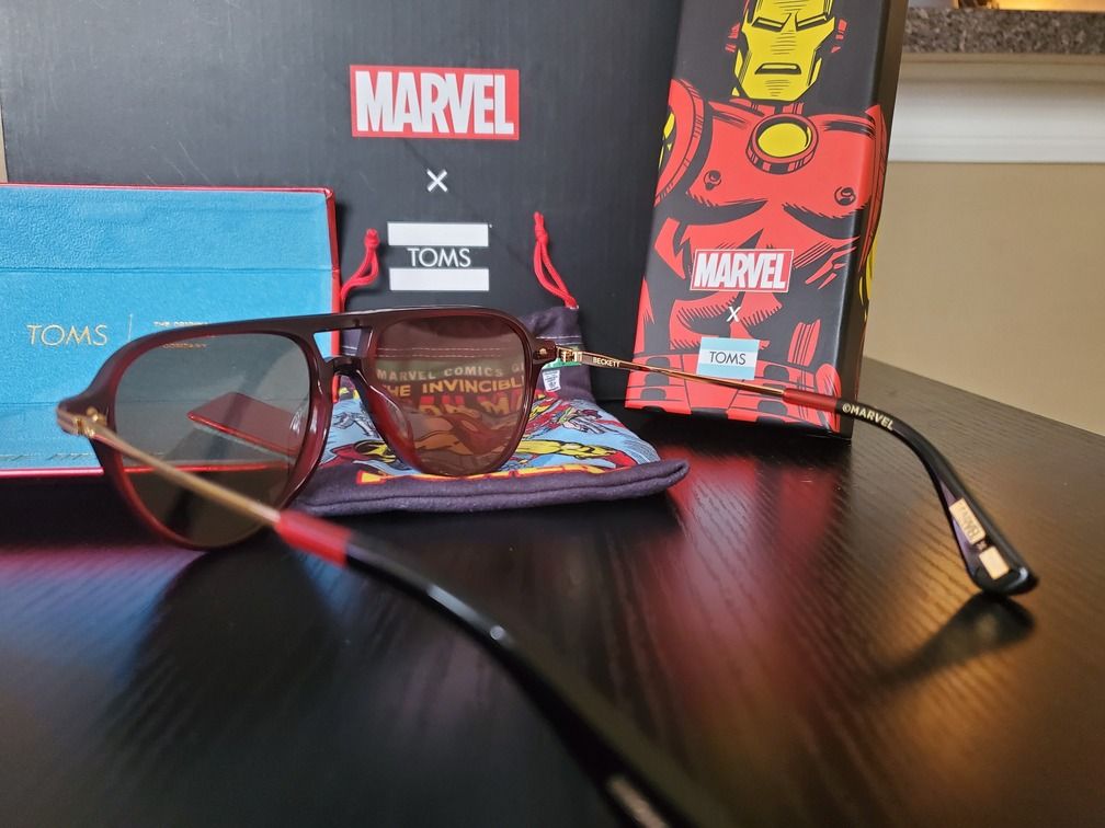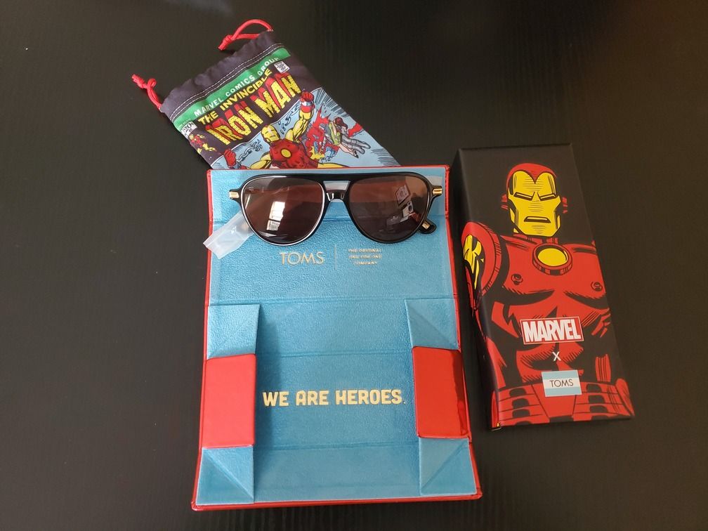 “Earth“s mightiest collection returns with limited edition aviators in Iron Man“s signature colors. A sleek handmade acetate and metal construction makes for a highly wearable frame, while custom temple tips featuring Marvel x TOMS logo lock-up and Iron Man mask in metallic gold embellishments himself deliver a subtle yet satisfying touch of fandom.”
