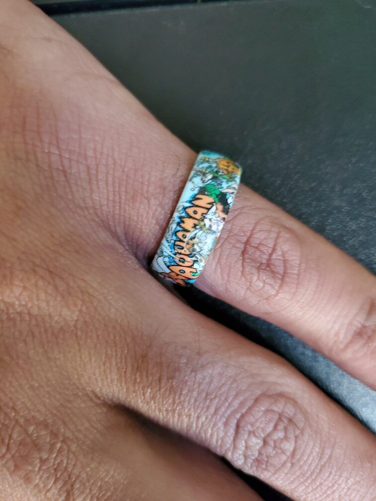 Not knowing my size lol I got a size 9 which fit onto my pinky. I really dig the colors and they are in fact Very comfy. I went to the LCS with them on and they noticed real quick and became a conversation piece. So as a geek this is definitely something affordable and cool to wear!