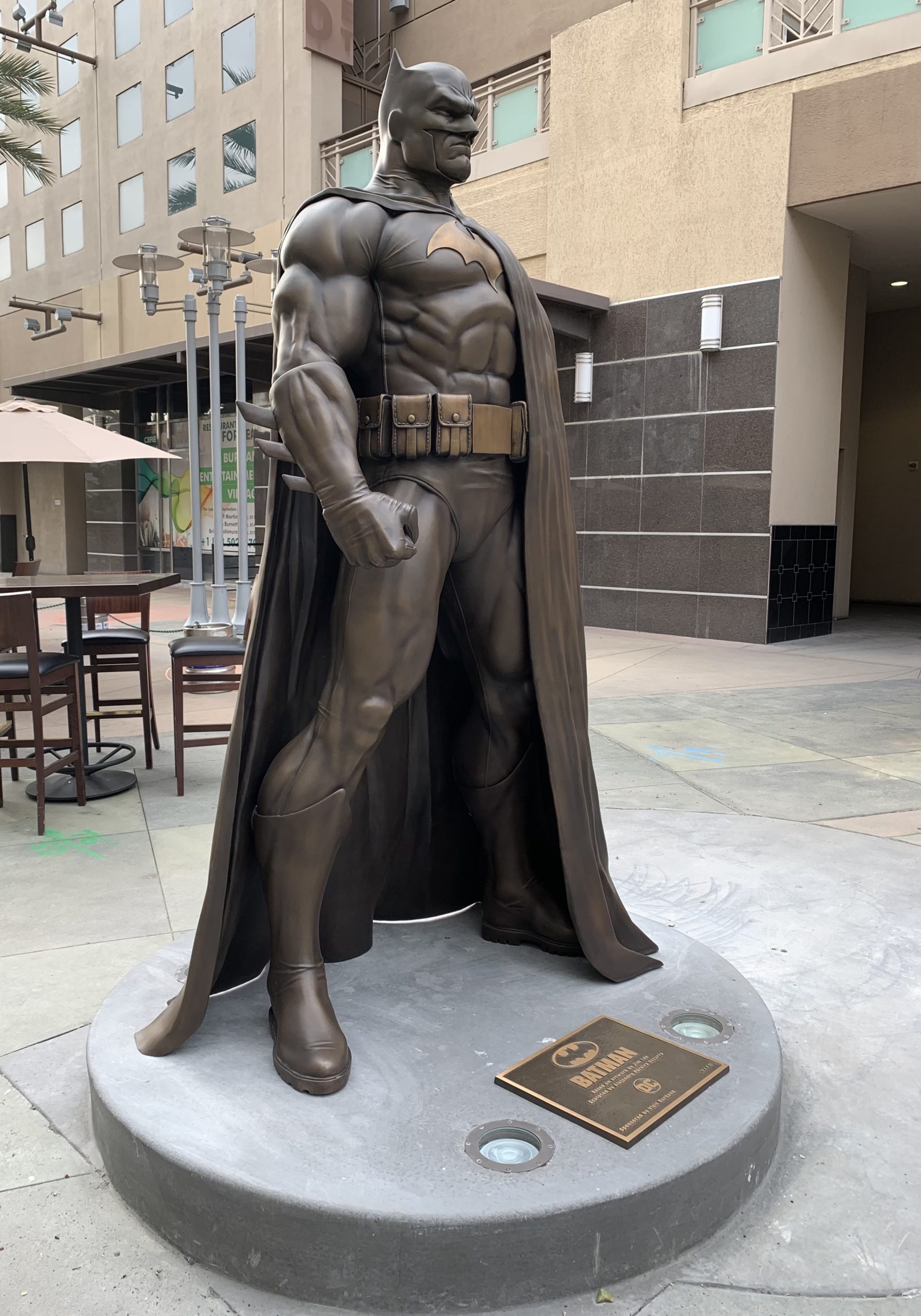 The newly installed Batman statue can be viewed in the AMC Walkway of Downtown Burbank. Visitors are strongly advised to practice social distancing and wear a face mask.