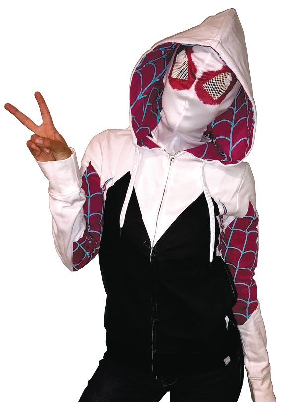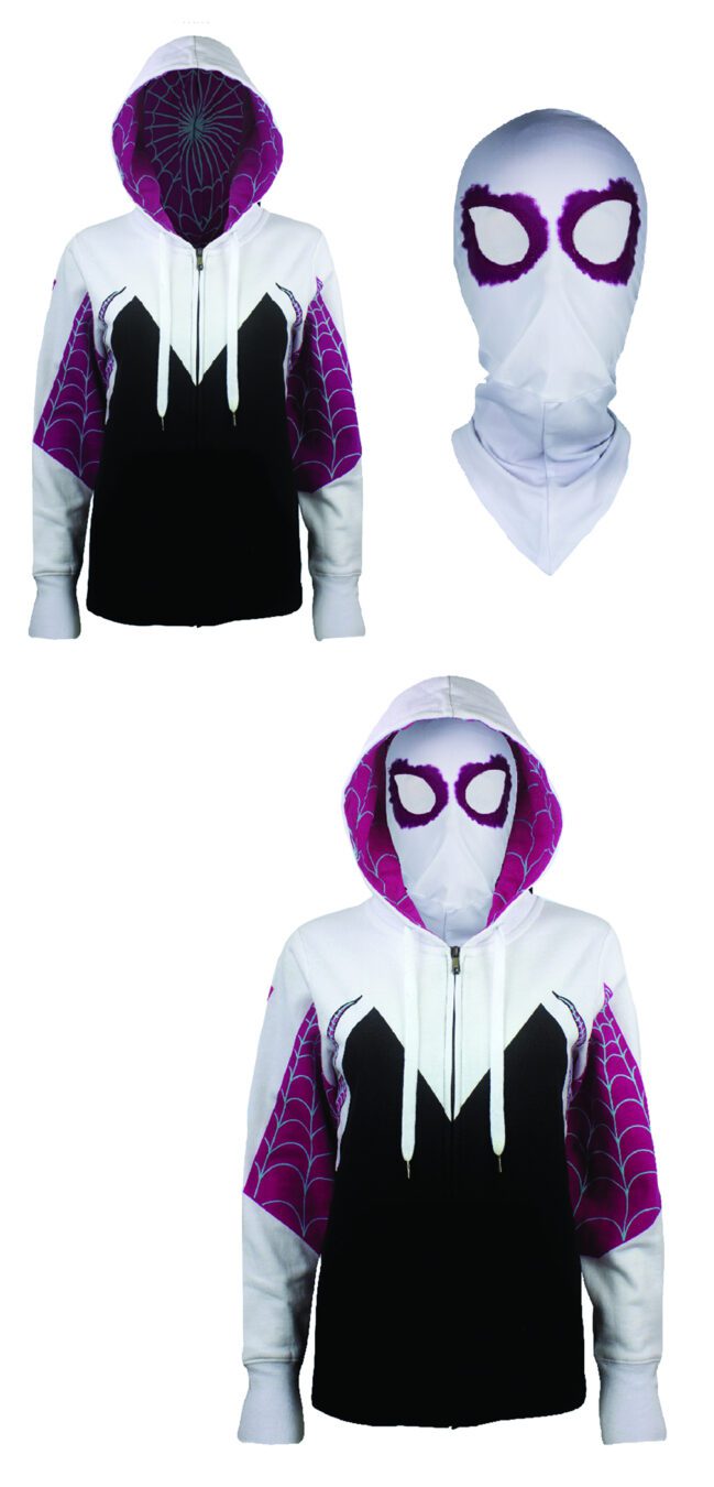 Fans can cosplay every day with this Spider-Gwen hoodie. Ranging in sizes from small to XXX-Large, it includes a pull over mask to hide your secret identity while you“re saving the city! The pull over mask includes mesh eyeholes to allow the wearer to see while they“re swinging through the streets.