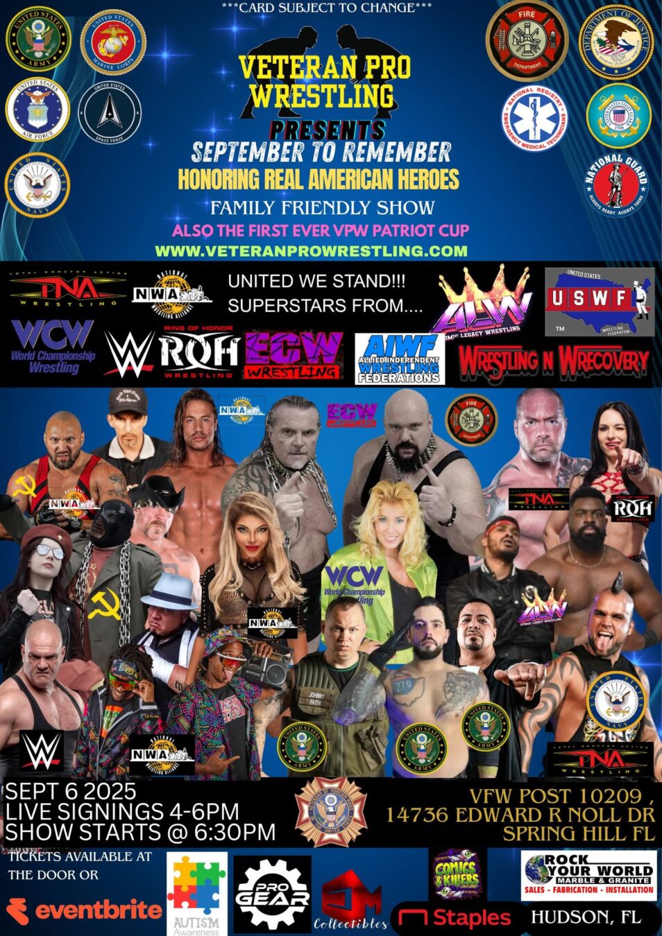 Veteran Pro Wrestling will be having a massive family friendly fanfest, pro wrestling event and Veteran Pro Wrestling Hall of Honor induction ceremony on September 6, 2025, at VFW Post 10209 address 14736 Edward R Noll Dr, Spring Hill, FL, United States, Florida. The event starts at 6:30. VPW will give 40 free tickets to Veterans, first responders and their families. There will be a 50/50 raffle, and the proceeds will go to the nonprofit organization Veterans Florida www.veteransflorida.org They are also involving the autism community to help spread awareness and understanding.