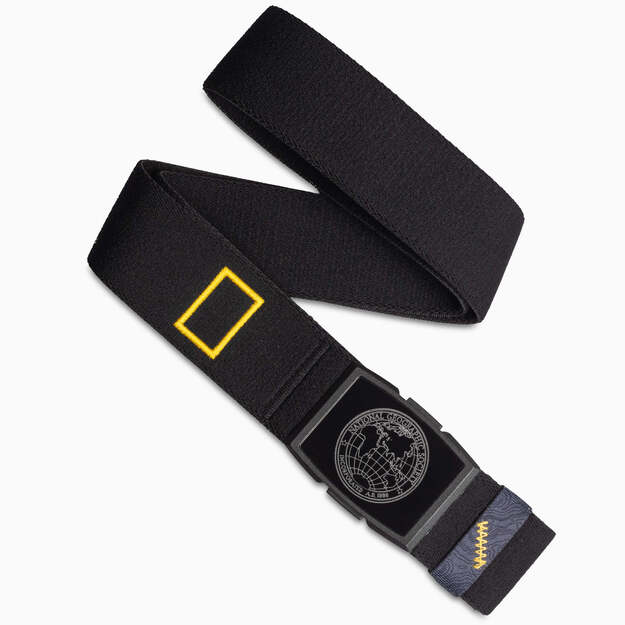 The three new belts are the National Geographic Topo, featuring black with yellow trim, Arcade’s A2 buckle, and the National Geographic and Arcade logos; National Geographic Collective, an eye-catching belt in National Geographic’s signature yellow with logos and A2 buckle; and National Geographic 1888 (the year of the first edition of National Geographic magazine), a black belt with a globe printed on a larger buckle, the yellow portal and National Geographic-inspired trim.