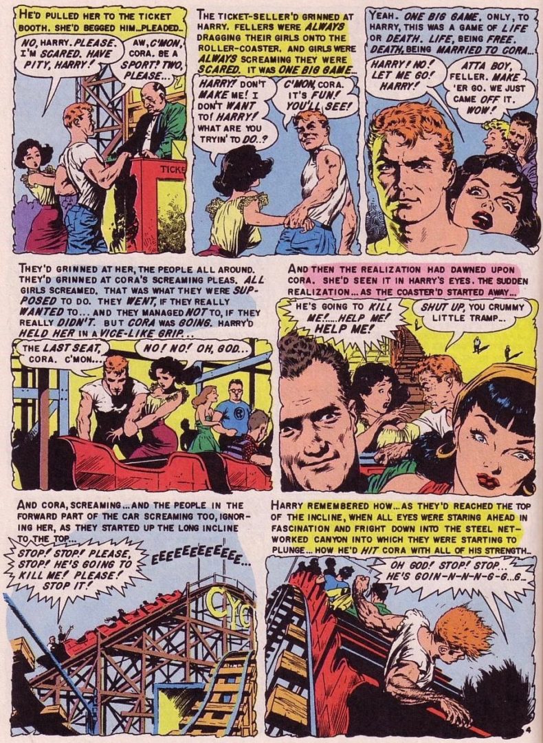 for the beach, there was not an iota of romance in sight on the splash page for “Squeeze Play”“. Sure, if you got your education at a liberal arts college, somewhere at the back of your mind you could see traces of a tortured Prometheus, the first superhero of in Greek mythology, in the way Frank drew Harry in a near crouch, with his knees bent and his upper torso leaned forward, his arms hanging between his legs. But Harry was not a titan and he was not on the run from the gods, but from the police. He felt trapped. Like many criminals, by violently freeing himself from one confinement, the one his girlfriend had sprung on him, he had moved himself into a corner. Or more precisely, to a spot under the boardwalk. Right from the start, Feldstein“s prose comes across much more purple and heightened than usually, almost as if to drive home the idea that this dark tale moved at its own frenzied pace. The writing style is a testament to how advanced his storytelling abilities had become: “Harry cowered against the rough concrete pillar that supported the weather-beaten boards overhead, sucking in the warm summer air in great gulps, trying to catch his breath. They were after him, soon they“d be searching down here, down in the damp sand beneath the boardwalk, searching for the killer. Harry looked around wildly. Where to hide? Where to run? And then he saw the shimmering mass of almost naked humanity that jammed the sunny beach”¦”“ This was when Harry stripped down to just his trunks, which gave Frazetta another shot at drawing Harry“s body which was muscular, but almost twisted into a knot with tension by this point. Harry was now near naked, but as attractive as Feldstein“s Peggy had been in nearly the same stage of undress, he was not. Harry was molded in the style of the Ancient Greeks“ ideal of a perfect man, but he was a tortured hero. After this cold open, something Feldstein had most likely learned from many film noirs, with Harry now reduced to the state of the first man, once he had shed his civilian identity and he“d become just one more body on a crowded beach, we slowly learn who this man is whose well-defined physique we find increasingly at ease after he“s managed to blend in. Feldstein goes for a triple approach, which often felt redundant in his earlier tales, telling the events via the captions, the dialogue or thought bubbles and the artwork, but which he and Frazetta manage pull off in perfect synthesis: “Harry grinned. He picked an open spot, between the laughing, perspiring groups of bathing-suit-clad people and sat down. Yes. He was free of Cora. She wasn“t going to tie him down. She wasn“t going to force him into a shot-gun marriage”¦ Cora was dead”¦”“ And from his thoughts we learn this: “Women! They“re all the same. Everything“s rosy, all fun, and then they start trying to grab on and hold”¦ then they start talking marriage”¦”“ Frazetta offered now some shots of Harry“s face that was tightening all the while his body grew relaxed. There were the memories that still haunted Harry. With an extensive flashback sequence, we learn that Cora obviously was the clingy type, at least that was how Harry remembered it now. She had been pestering him about getting married. And then she had phoned him up. They had to meet, she had said. Once again, she had asked him when they were getting married. Once again, he had stalled her. But this time was different, alright. “She“d told him. And Harry“s blood had froze in his veins. He“d been trapped.”“ He had suggested a trip to the beach. While they strolled along the promenade that the boardwalk offered with its smells and its little storefronts, like he possessed a time machine, his mind flashed forward to his future: “Now I“ll be tied down to a crummy apartment, punching a time-clock, sweatin“ t“pay bills, and stayin“ in every night with a bawlin“ brat”¦”“ While one of the shops promised fun in bold letters, his fun times were over it seemed. But then he had seen the solution. The roller-coaster. Like a caveman, he dragged Cora over to the attraction. Cora“s protestations only brought forth a few grins from some other guys. They knew that a girl might say no, but in reality, she meant yes. It was a game. Like Harry told her: “It“s fun! You“ll see!”“ But still, Cora refused to do this willingly. Her brain sensed what was coming, but Harry would not let her get out of this trap. Once they were in one of the open cars, riding high on the wooden tracks, his face tightened, his visage wet with perspiration. This was when things got real. Cora shouted: “He“s going to kill me! Help me!”“ And Harry showed his true mettle: “Shut up, you crummy little tramp.”“ This was the moment when he violently pushed her out of the car. For what seems to be a moment frozen in time, Harry remembers how he“d watched Cora fall to her death: “”¦ how her body“d bounced against the girders, twisting and turning as it fell to the pavement far below”¦”“ However, in a powerful twist, it is not through Harry“s eyes that we see this scene in the flashback sequence. Frazetta chooses instead to put the camera behind Harry“s head, his strained neck and his arched back. We become spectators as well, almost as if we are seated in one of the other cars. We see Harry and we see Cora“s descent to the ground, Cora with her skirt blowing in the wind and her arms and legs stretched out as if they were looking for a point to grab onto, any point, really. And immediately we see Harry“s spiel. He clutches his hand against his eyes, like a cursed man who had an especially damning truth shown to him by an oracle and who wants to purge this image from his mind by choosing to go blind. But once he has his feet back on the ground again, the crowd is not buying what he is selling. While he insists that she fell, the same folks who“d laughed wh