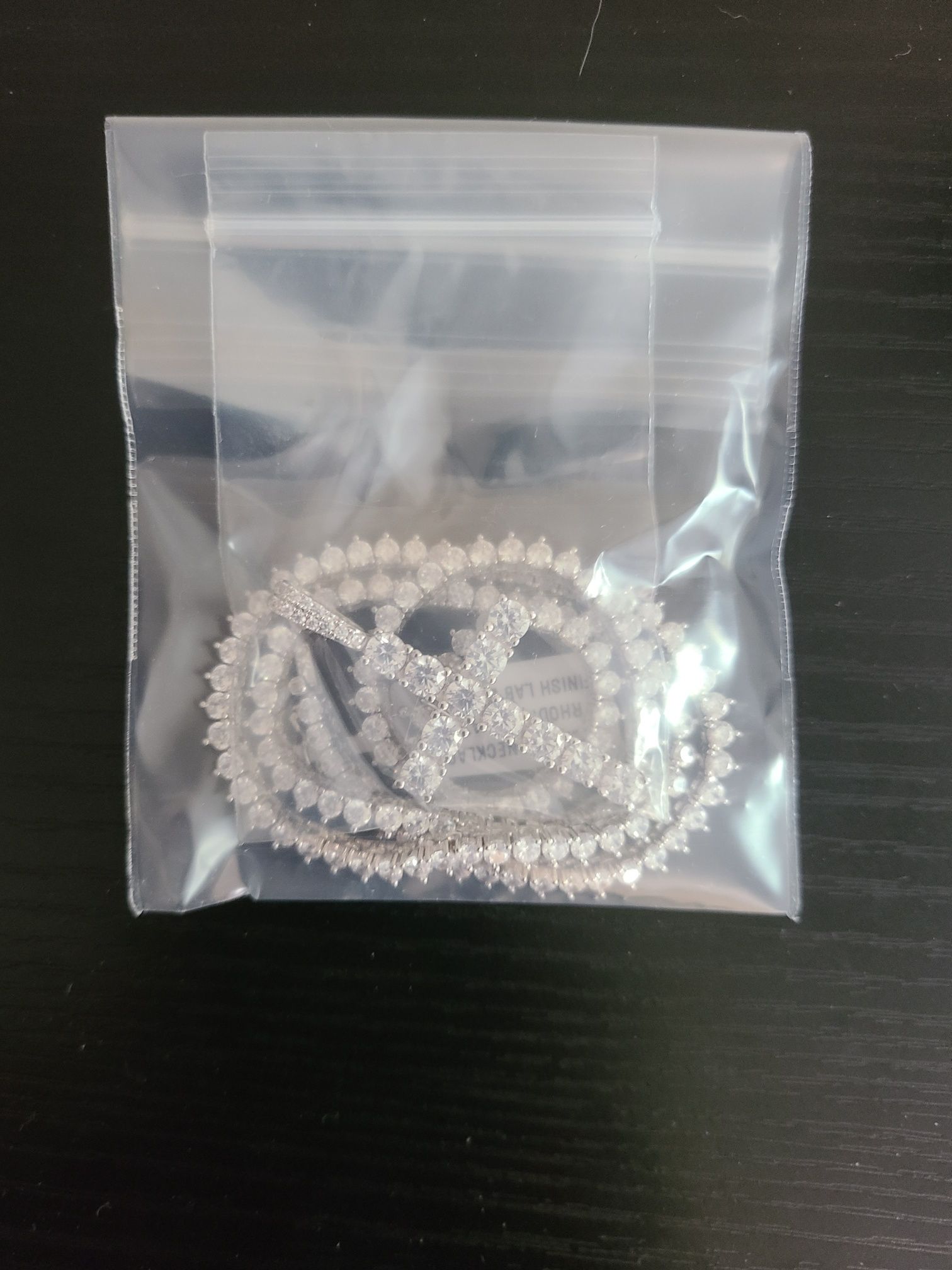 The packaging is very fancy looking with a case that has a magnetic clasp, upon opening you’ll discover a squeeze open leather pouch emblazoned with the Klase logo, it makes for a very nice looking presentation. The items are then individually zip-locked within the pouch ready to get setup and shown off. The cross is blinged out and looks great with a nice weight to it. The tennis chain has a box clasp and also on the uber shine side, but if you don’t mind being shiny, this is a very worthy chain! Take a look below: