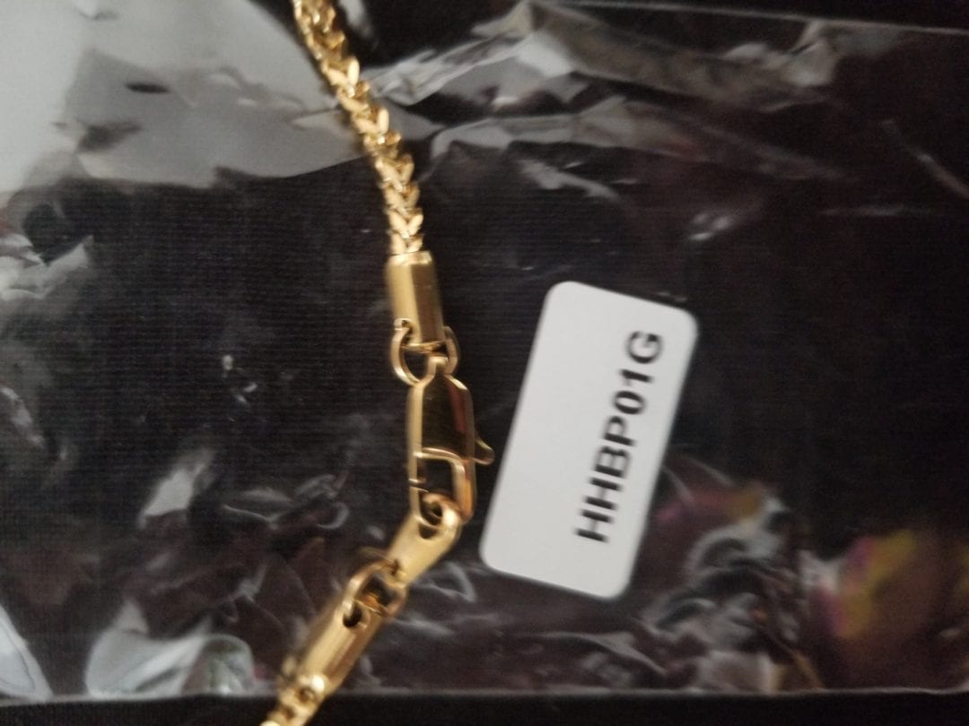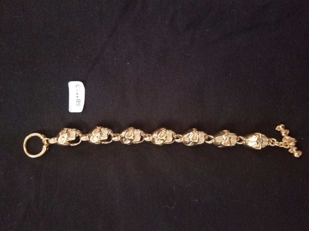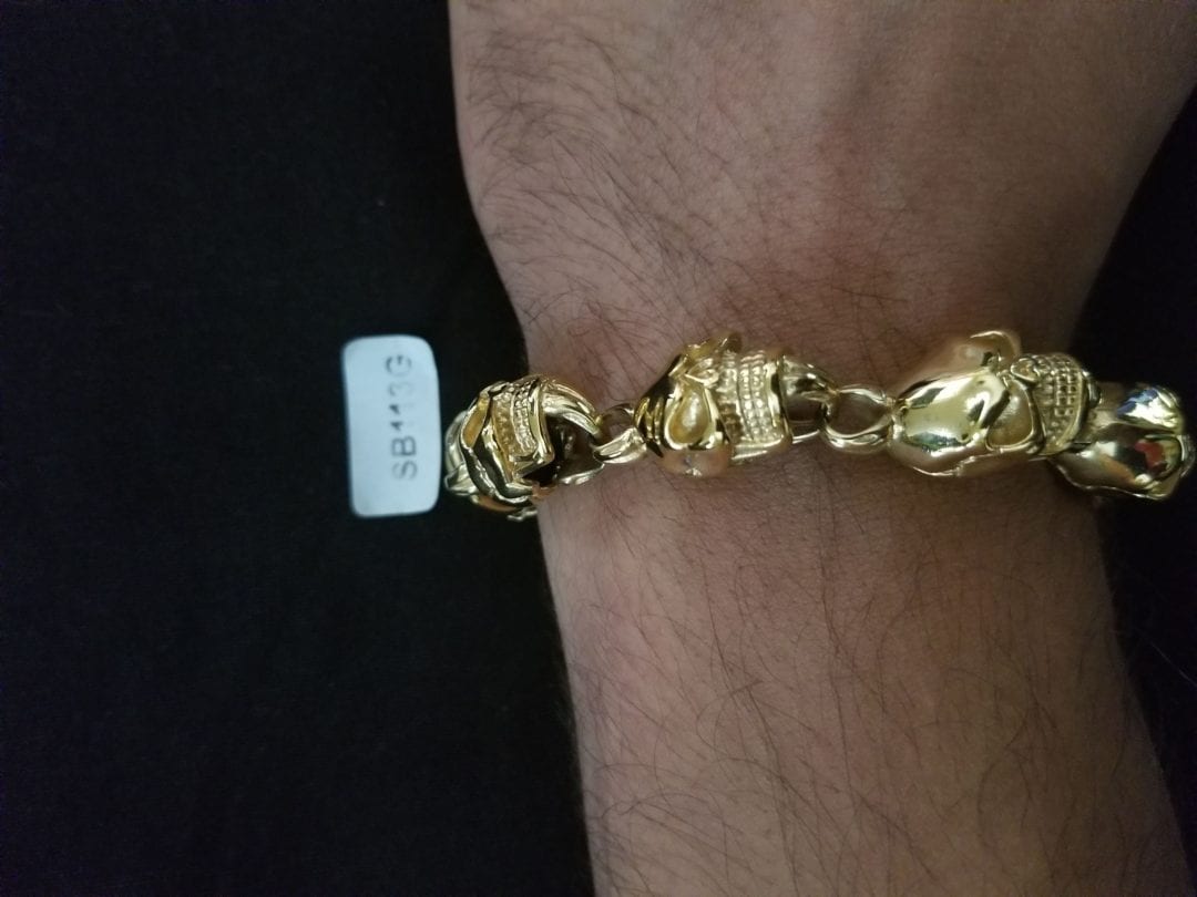 SKULL LINK GOLD STAINLESS STEEL BRACELET -Â SKU:Â SB113G: This product got plenty of compliments when wearing this product and is not as heavy as it looks. It is simple in design and not crazy bulky with no extra bling added but the look is just eye-catching.Â