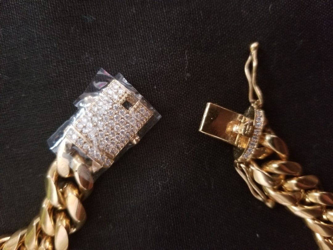 CZ DIAMOND LOCK CUBAN CHAIN 12MM GOLD STEEL -Â SKU:Â HC8912G-36: This chain has some weight to it but looks amazing when worn and the clasp is secure looks fantastic with the touches of bling to it.