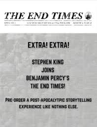 Bad Hand Books, an independent publisher of genre fiction based in South Dakota, is thrilled to announce that legendary horror author Stephen King has joined us as a contributing writer for Benjamin Percy’s The End Times. The short, serialized novel will begin publishing in November as a monthly newspaper in physical and digital formats.