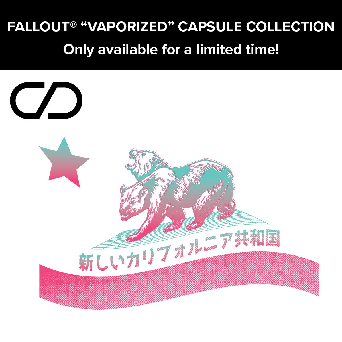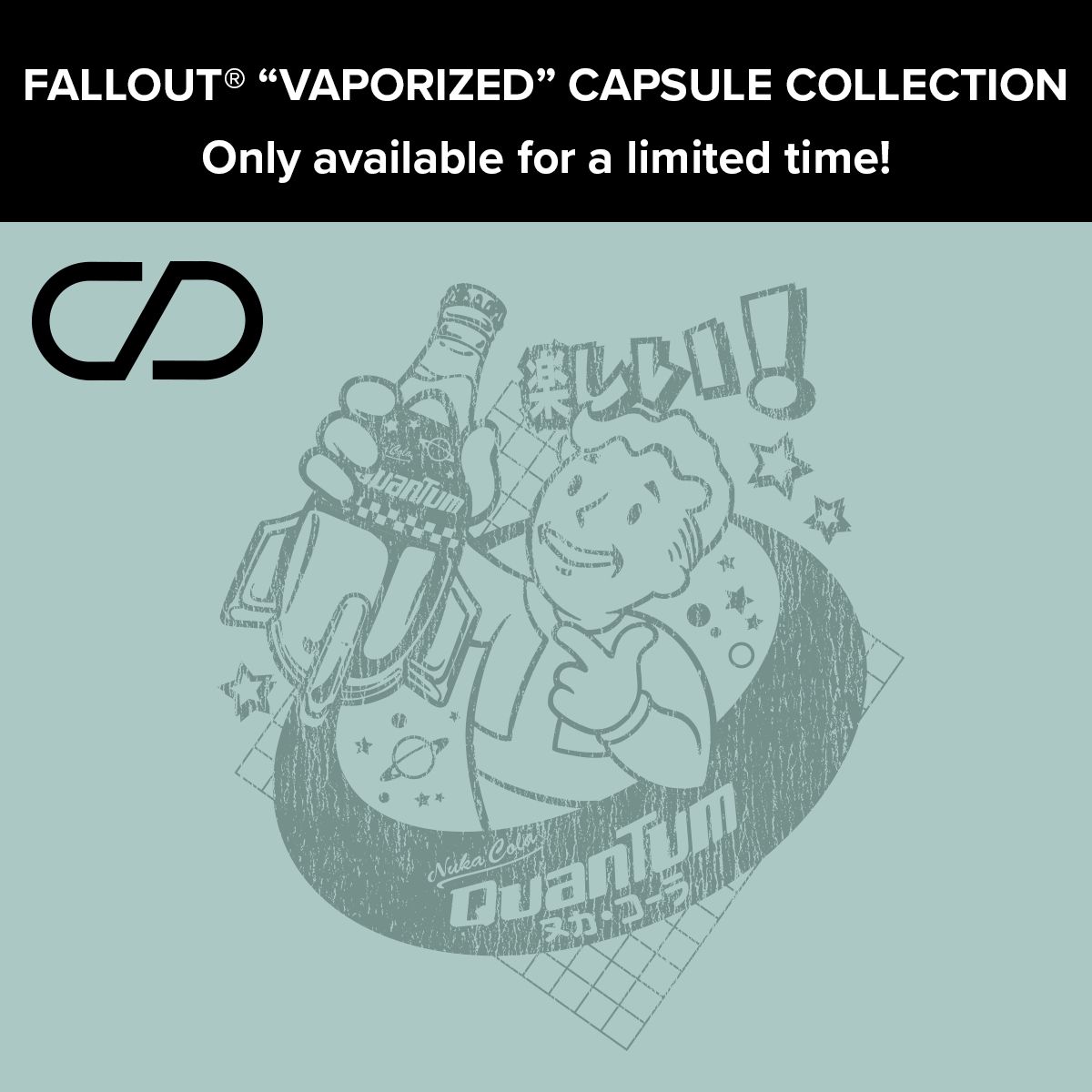 The “Vaporized”“ Fallout Capsule Collection includes four different designs exclusive to this collection. Designs include a Power Armor Plateau T-shirt, an Atom Drop T-shirt, Quantum Cola T-shirt and an NCR T-shirt.