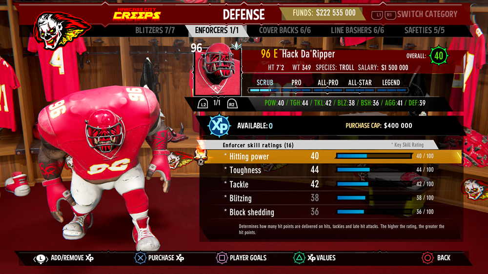 Monster Squad: Choose from over 35 MFL teams composed of maniacal mutant versions of pro football superstars — 32 pro-league teams like the Karcass City Creeps, Killadelphia Evils, and Blitzburgh Steelheads, and 3 minor league teams like the Orcs of Hazards and Tokyo Terminators. MFL player cards also unlock historic players who can be signed in Free Agency; So, if you’d prefer to be a special snowflake, you can create an original team and craft a legacy of your own.