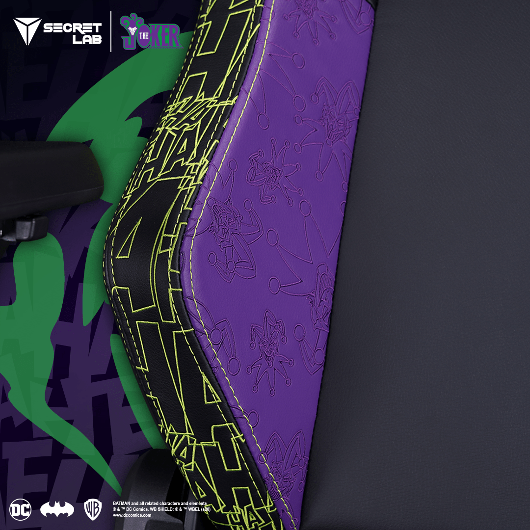The Secretlab ”˜The Joker“ Edition chair honors Gotham“s ever-present jester, capturing his sinister comedic spirit with a bold, transgressive design that mirrors the criminal clown. Inspired by The Joker“s flamboyant personal style and signature suit, the chair features a rich purple seat base and searing, acid green embroidery that immortalizes his unceasing laughter. The jester“s hat is stitched onto the wings in matching purple thread, a repeating design motif that is at once chaotic and gleeful.