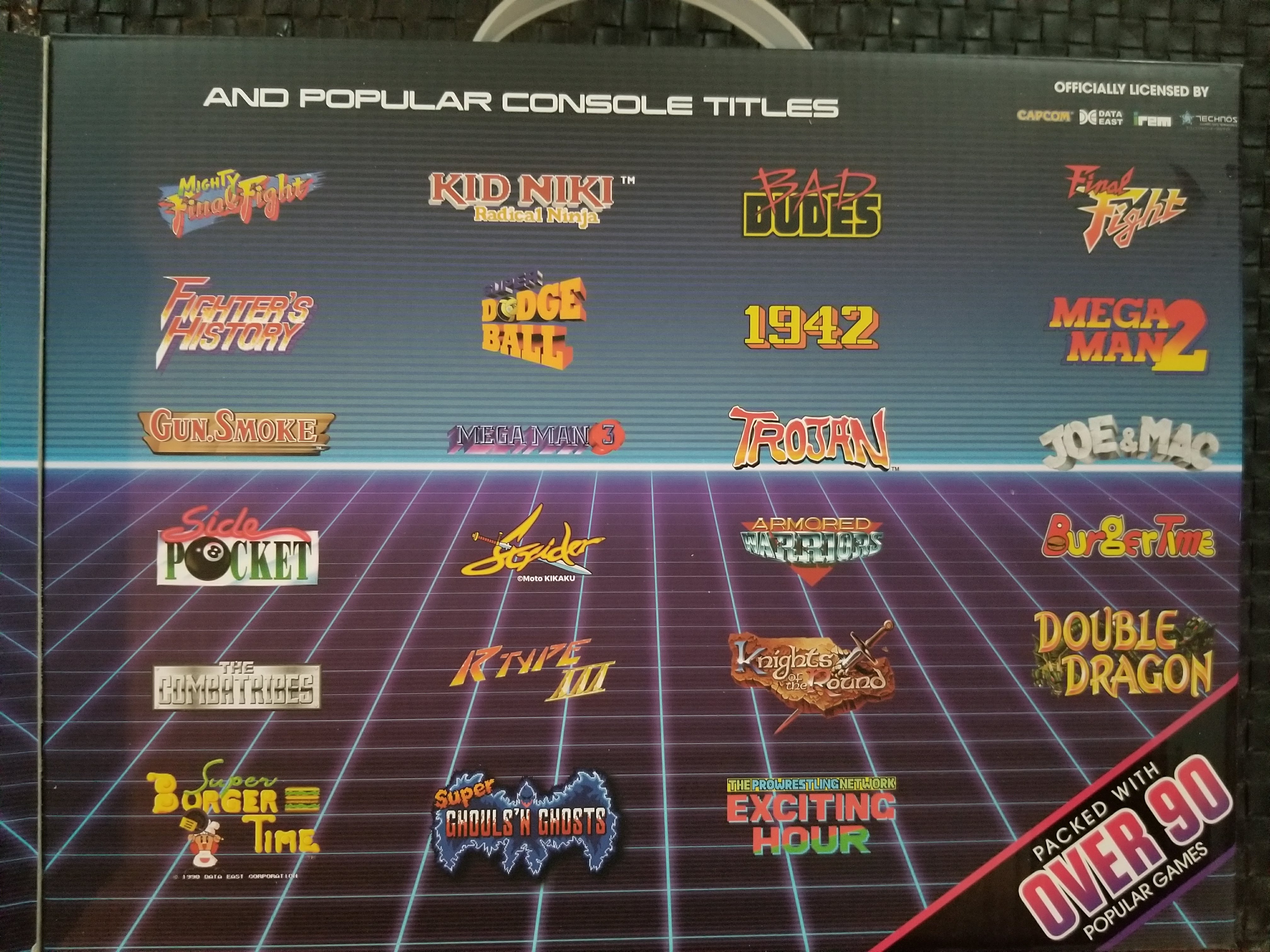 Let’s start with the packaging, it looks great, eye-catching with Mega Man on the cover, lift up the lid and you get a breakdown of the most popular bunch of the titles in the console. Flip it over you get some details and a full list of titles included. The box is made for portability as it has a built in handle. Go here to see complete list. See pics below: