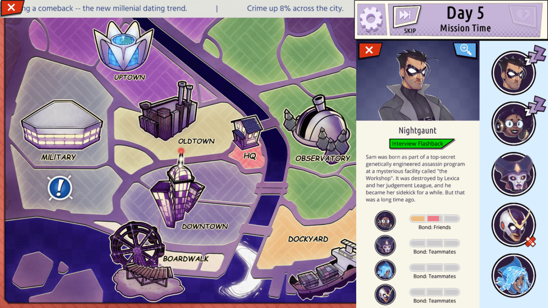 Within this narrative matching-making extravaganza, players pair various superheroes in hopes sparking a love (or friendship) that will save the world from imminent destruction. Players choose between five heroes of varying genders and orientations to work on cultivating strong connections through missions, dates, and other shenanigans. The stronger and more compatible the relationship, romantic or platonic, the higher the chance of protecting the planet.
