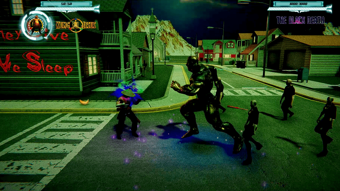 At its heart, Kung Fu Jesus is a story-driven RPG beat ‘em up with unlockable combos and special abilities. Players enter the world of Kung Fu Jesus, where they quickly start to see things from the point of view of a schizophrenic facing his own mental illness … with his fists. Going deeper and deeper into an alternate reality, Kung Fu Jesus soon finds out that everything he’s read and seen (from the Bible and David Icke to Carlos Castaneda and John Carpenter’s They Live) turns out to be true …