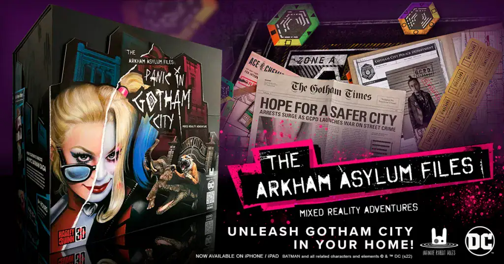 Infinite Rabbit Holes, the team behind 2008’s award-winning The Dark Knight ARG campaign Why So Serious?, in partnership with Warner Bros. Discovery Global Consumer Products today announced the official launch of The Arkham Asylum Files: Panic in Gotham City, a first-of-its-kind game that seamlessly blends state-of-the-art AR technology with immersive storytelling. Players solve mysteries on the streets of Gotham City with DC’s Harley Quinn, Batman and The Joker. This epic new form of at-home entertainment combines the best elements of collaborative play to immerse players deep inside Batman’s universe in a way that revolutionizes game night.