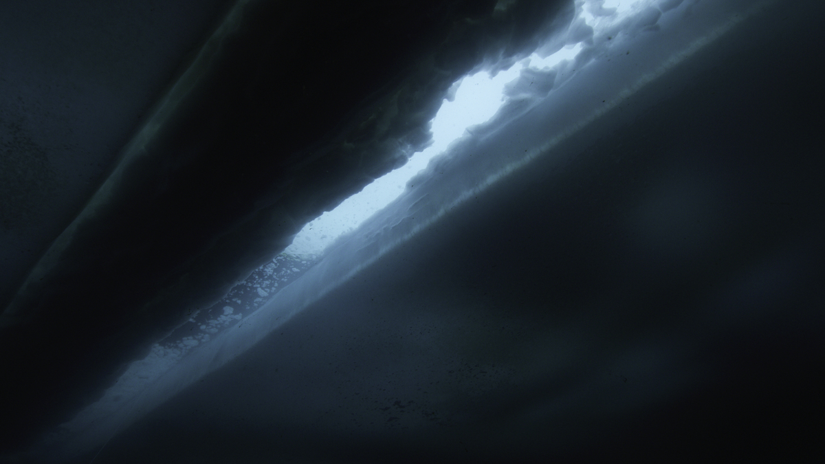 Leads are narrow, linear cracks in the ice that form when giant floes move parallel to each other. They become whale highways until the ice completely breaks apart. (National Geographic for Disney+/Ernie Kovacs)