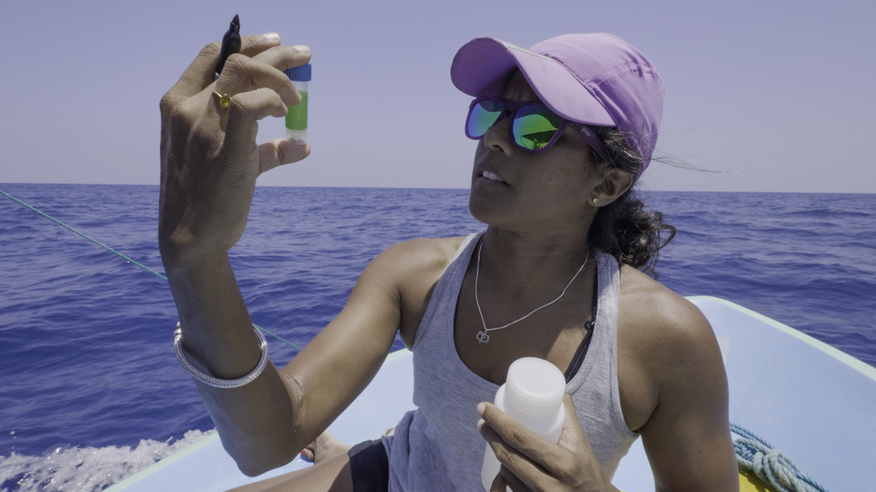 Marine biologist Asha DeVos studies a sample of sperm whale dung, which will give her clues into what the whales are eating. (National Geographic for Disney+/Andrew Mitchell)