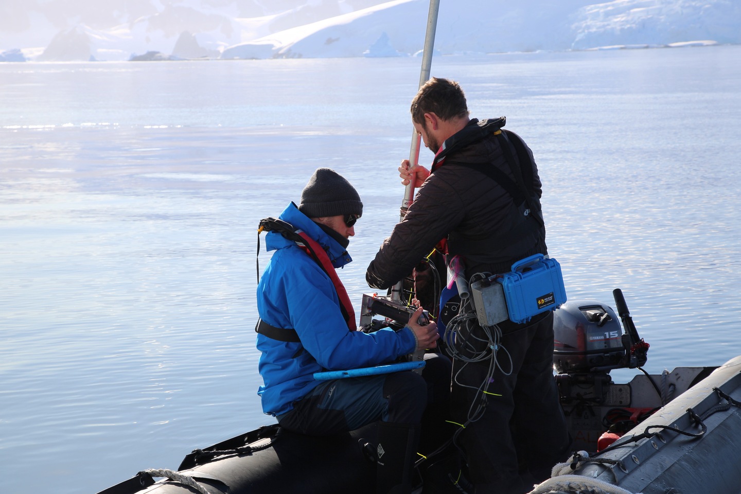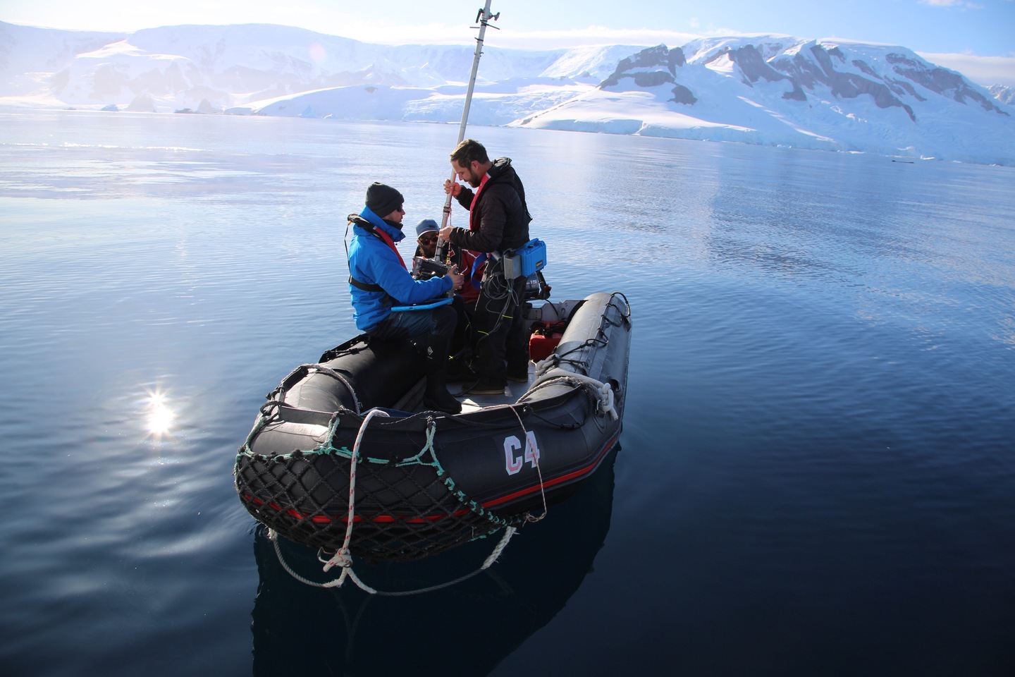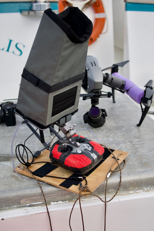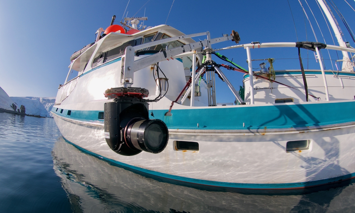 A custom, motorized pole-cam rig that can shoot partially submerged whales while traveling up to four knots. (National Geographic for Disney+/Brian Armstrong)