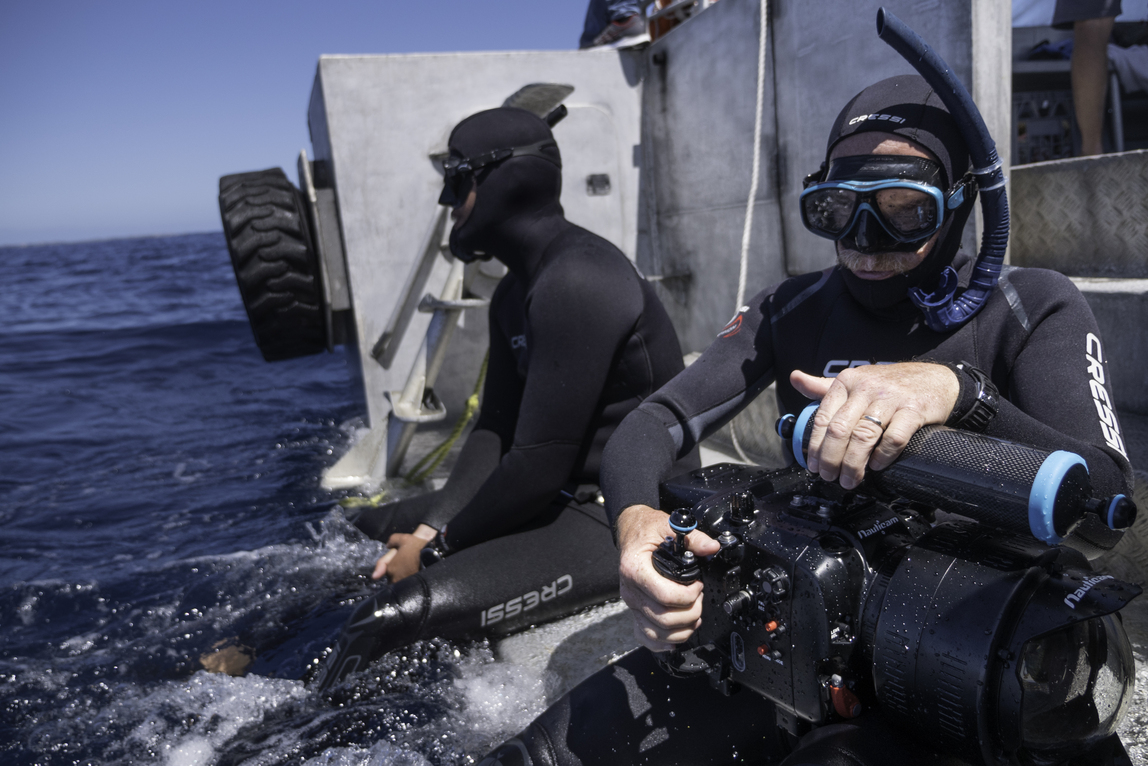 Underwater cinematographer Adam Geiger prepares to dive with humpback whales. (National Geographic for Disney+/Brian Armstrong)