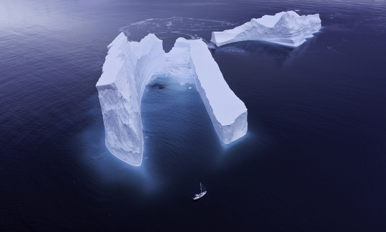 Antarctic icebergs dwarfed the team’s expedition vessel, The Australis, while the team filmed humpbacks at the bottom of the world. (National Geographic for Disney+/Hayes Baxley)