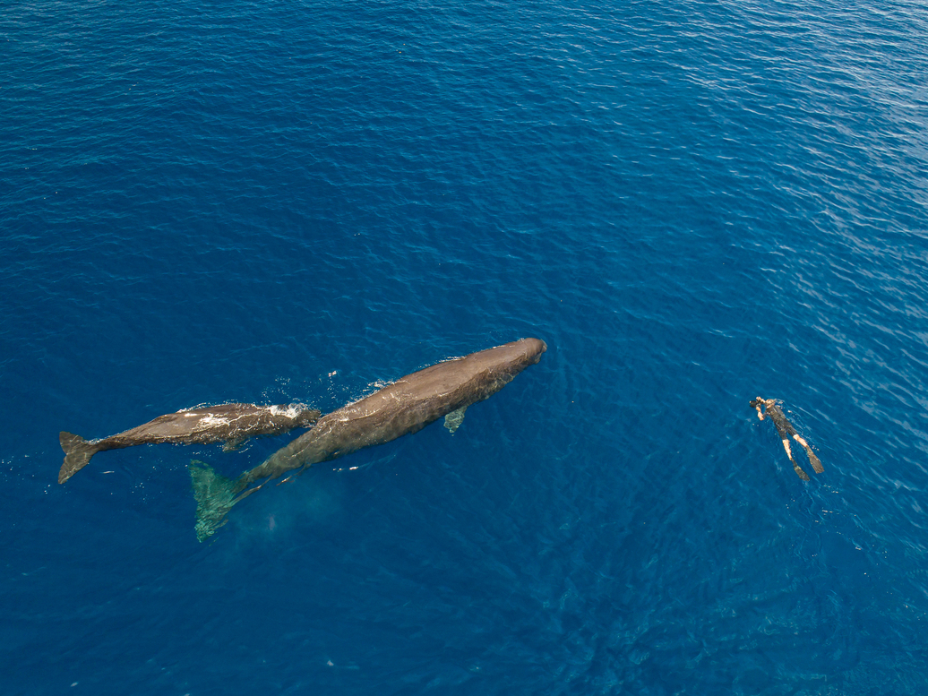 An aerial view of Brian Skerry photographing a sperm whale mom and calf off the coast of Dominica. (Steve De Neef)
