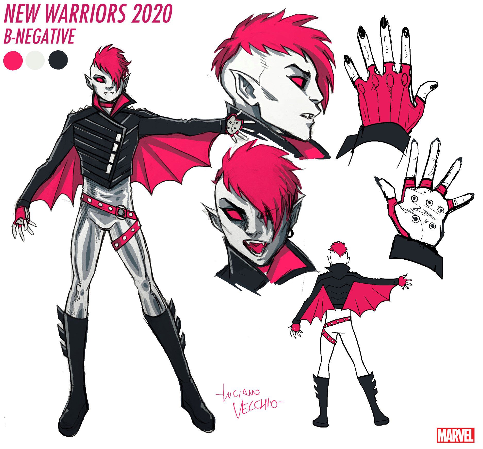“B-Negative is the goth kid. When he was a baby he got a rogue lifesaving blood transfusion, we assume, from Michael Morbius. And now he has a very similar look, and very similar vampire powers”¦B-Negative ages like a regular person (or does he?) and he definitely drinks blood (or does he?), but designer/artist Luciano Vecchio took brilliant inspiration from the ’90s Spider-Man cartoon and gave B-Negative the ‘leech suckers’ that the animated version of Morbius had on his palms.”“